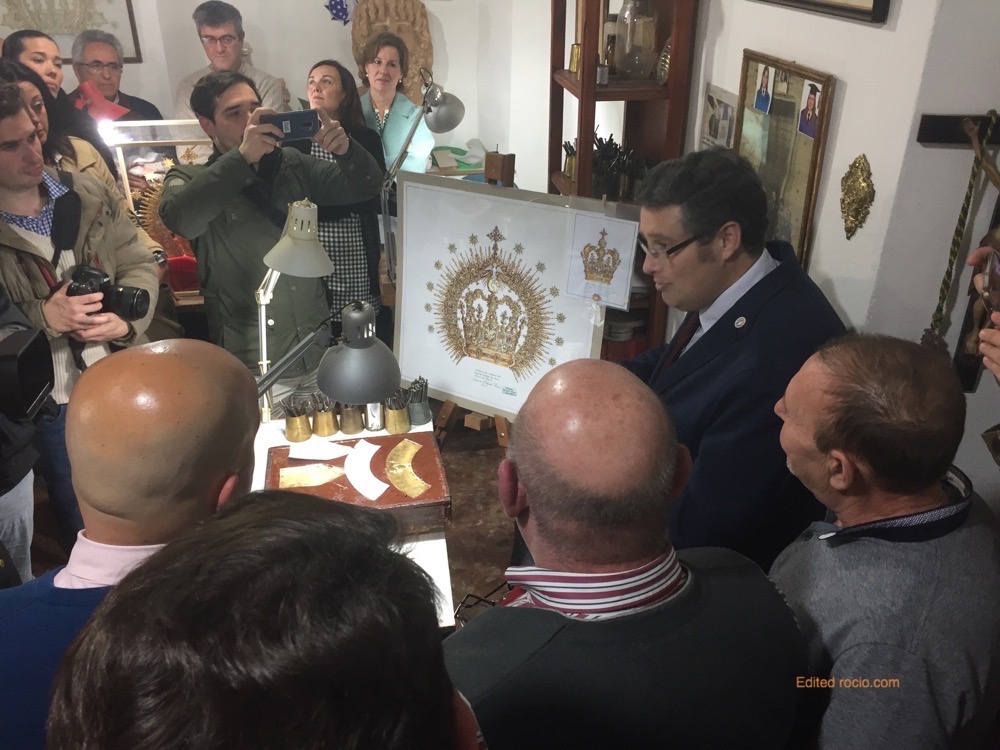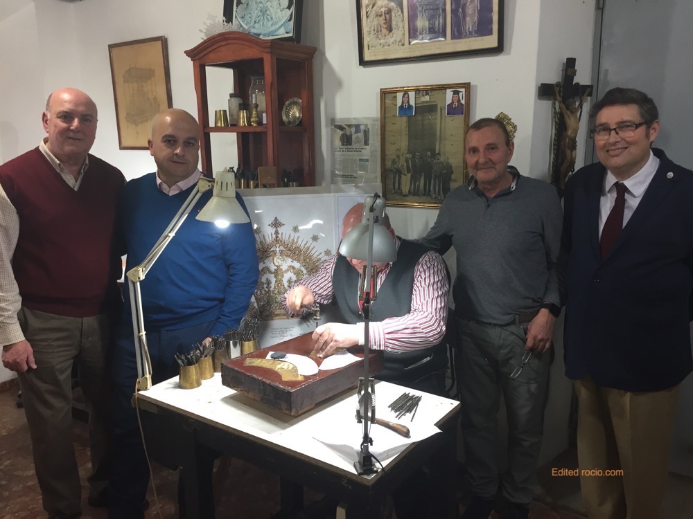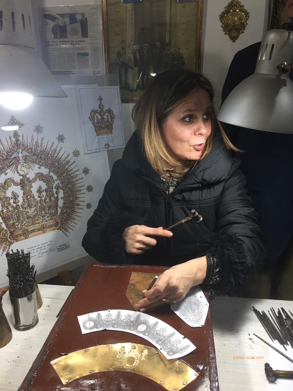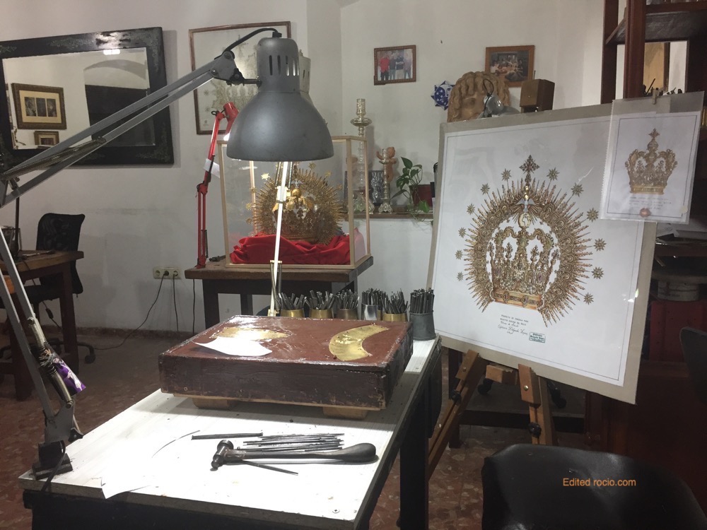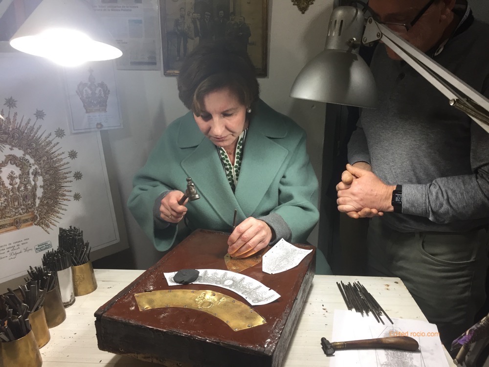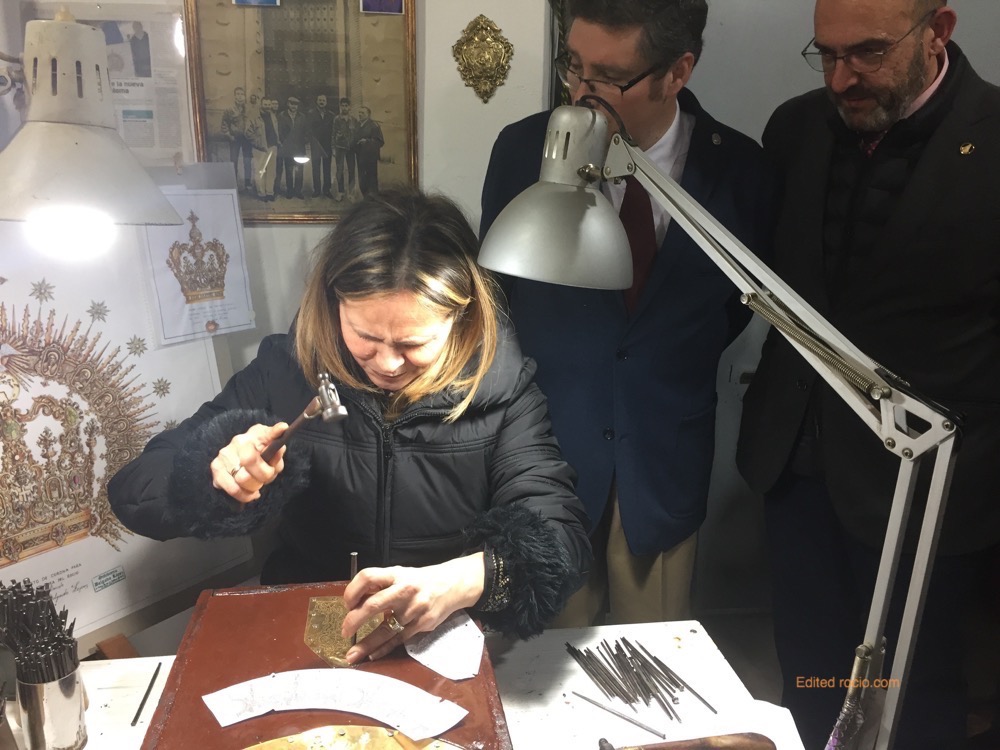 En la tarde de hoy, jueves 24 de enero, a las 20 h, ha tenido lugar en Sevilla, en el taller de Orfebreria de los hermanos Delgado López, donde se están realizando las coronas de la Santísima Virgen del Rocío y su Hijo el Pastorcillo Divino, con motivo del centenario de la coronación canónica, el acto simbólico del primer toque de cincel en las dichas preseas.