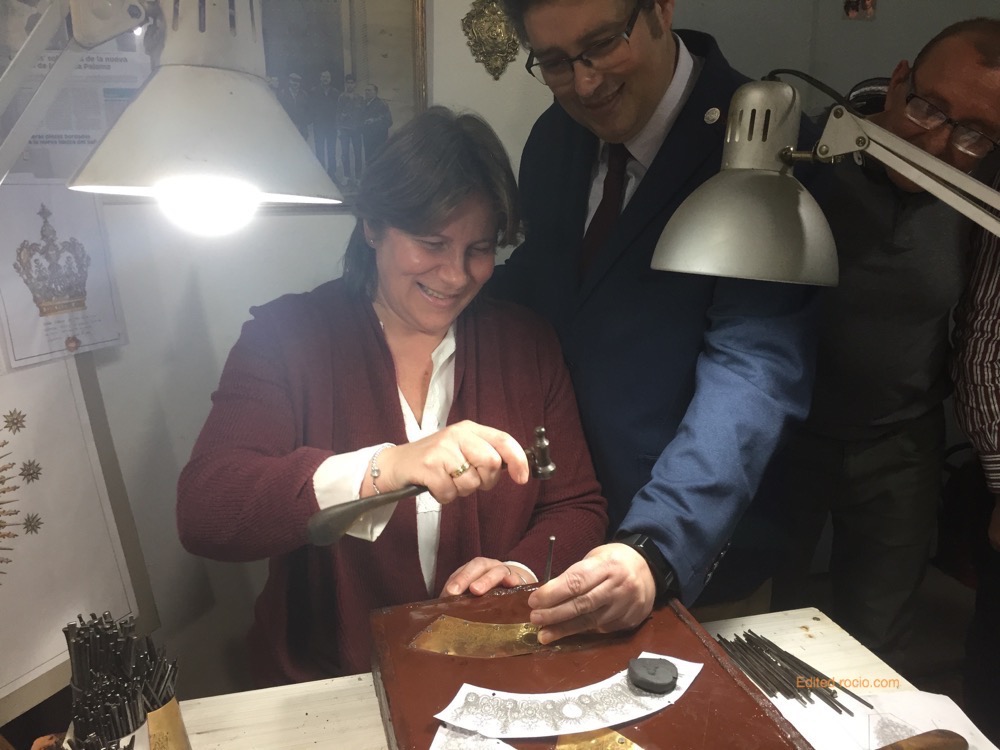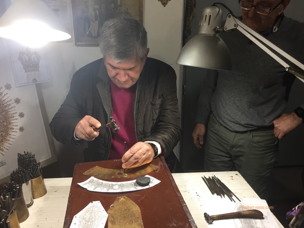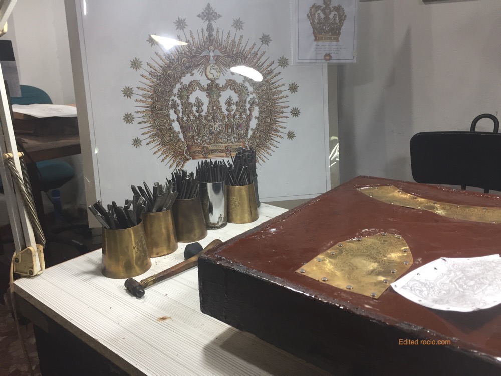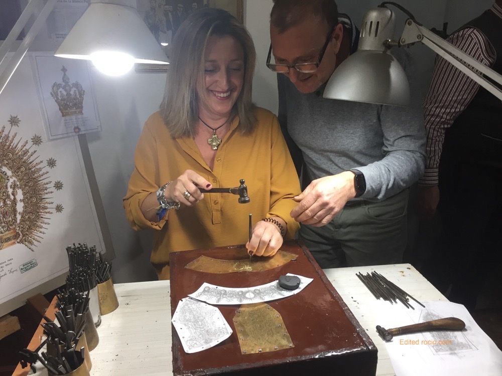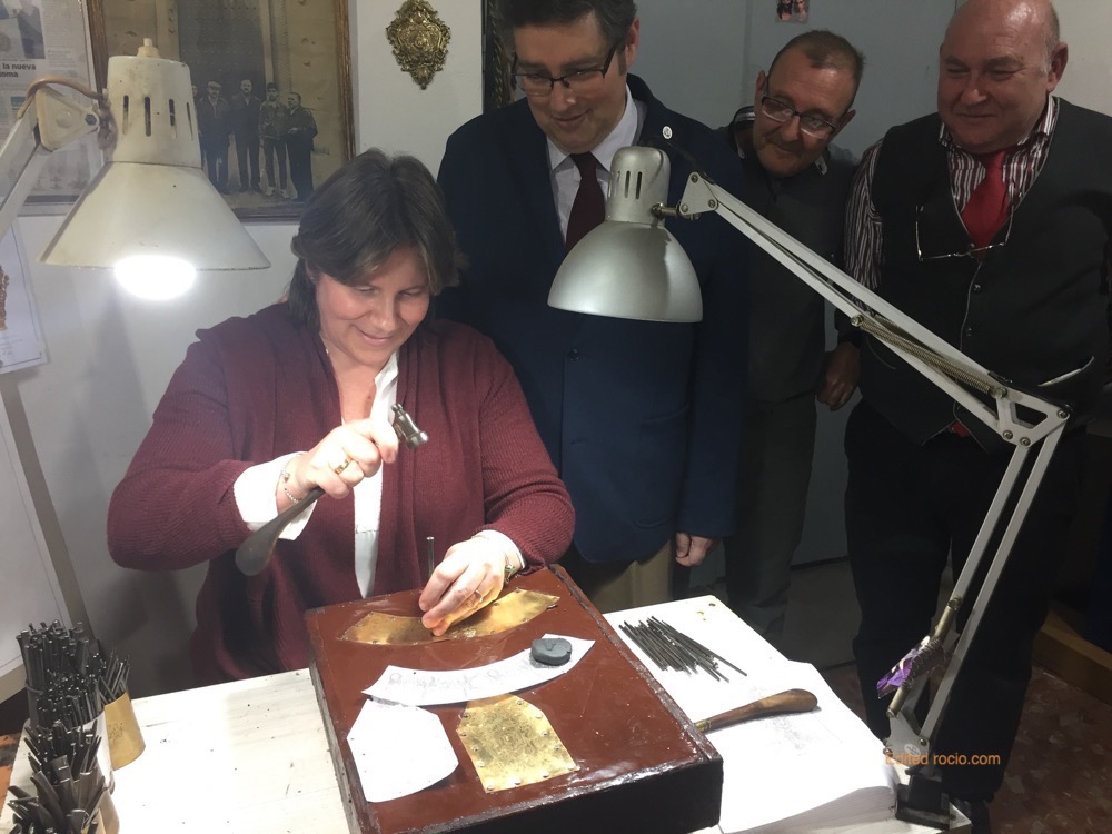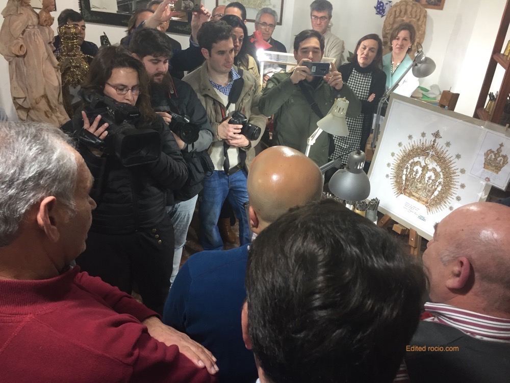 En la tarde de hoy, jueves 24 de enero, a las 20 h, ha tenido lugar en Sevilla, en el taller de Orfebreria de los hermanos Delgado López, donde se están realizando las coronas de la Santísima Virgen del Rocío y su Hijo el Pastorcillo Divino, con motivo del centenario de la coronación canónica, el acto simbólico del primer toque de cincel en las dichas preseas.