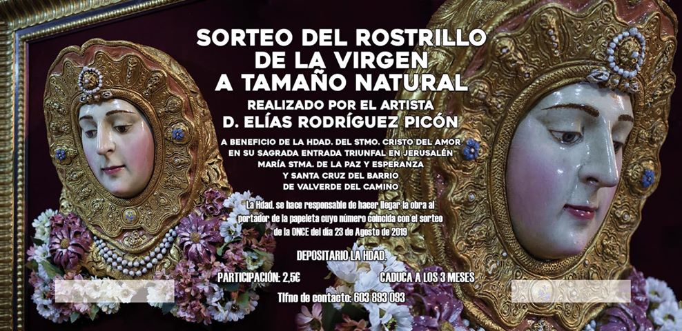 El imaginero rocianero Elías Rodriguez Picón, ha modelado un rostrillo a tamaño natural de la Virgen del Rocío para colaborar con que la Hermandad de la Santa Cruz del Barrio, Santísimo Cristo del Amor en su entrada triunfal en Jerusalén y Maria Santísima de Paz y esperanza, se va a rifar a fin de sufragar los gastos que ocasiona la terminación del paso de misterio del Cristo del Amor (la Borriquita), las papeletas se ponen a la venta al precio de 2’50€ y se rifara en agosto de 2019.