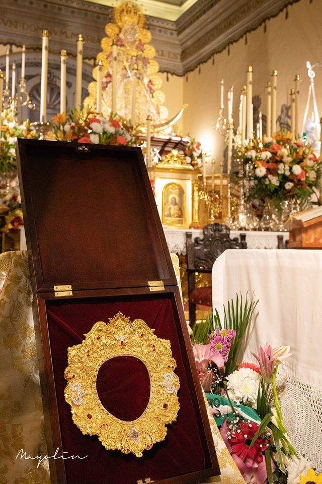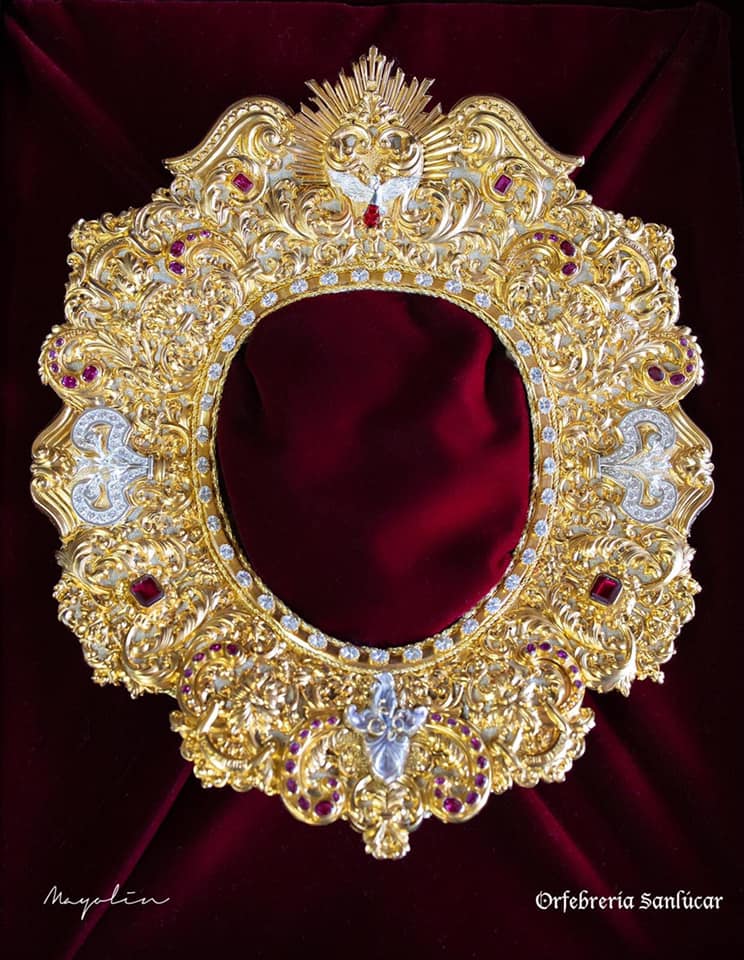 Elaborado por ellos mismos, en el taller Orfebrería Sanlúcar. Es de estilo barroco, cincelado en plata sobredorada, con engaste de pedrería fina, flor de romero esmaltada al fuego en la parte baja, ramilletes de azucenas en sus laterales, en plata, y la paloma del Espíritu Santo que sostiene una piedra en forma de gota, en su pico, en la cartela central. Todo montado sobre fondo de tisú de plata.