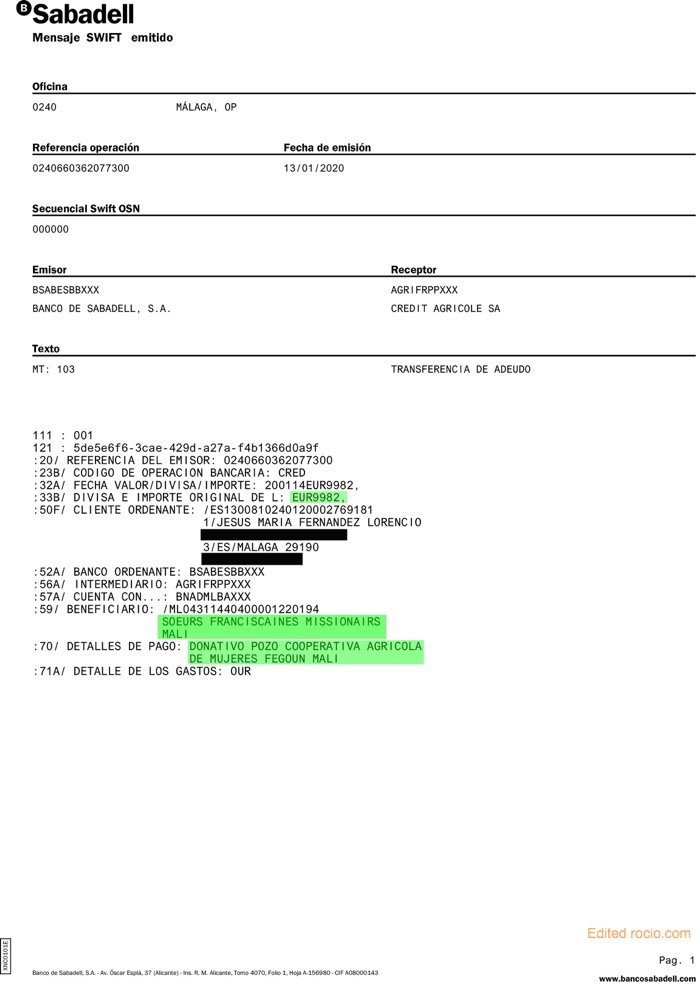 Ofrenda del Foro 2019 – Extractos bancarios e ingreso transferencia a las Hermanas Franciscanas Misioneras en Mali para la construcción de un pozo para una Cooperativa de Mujeres.