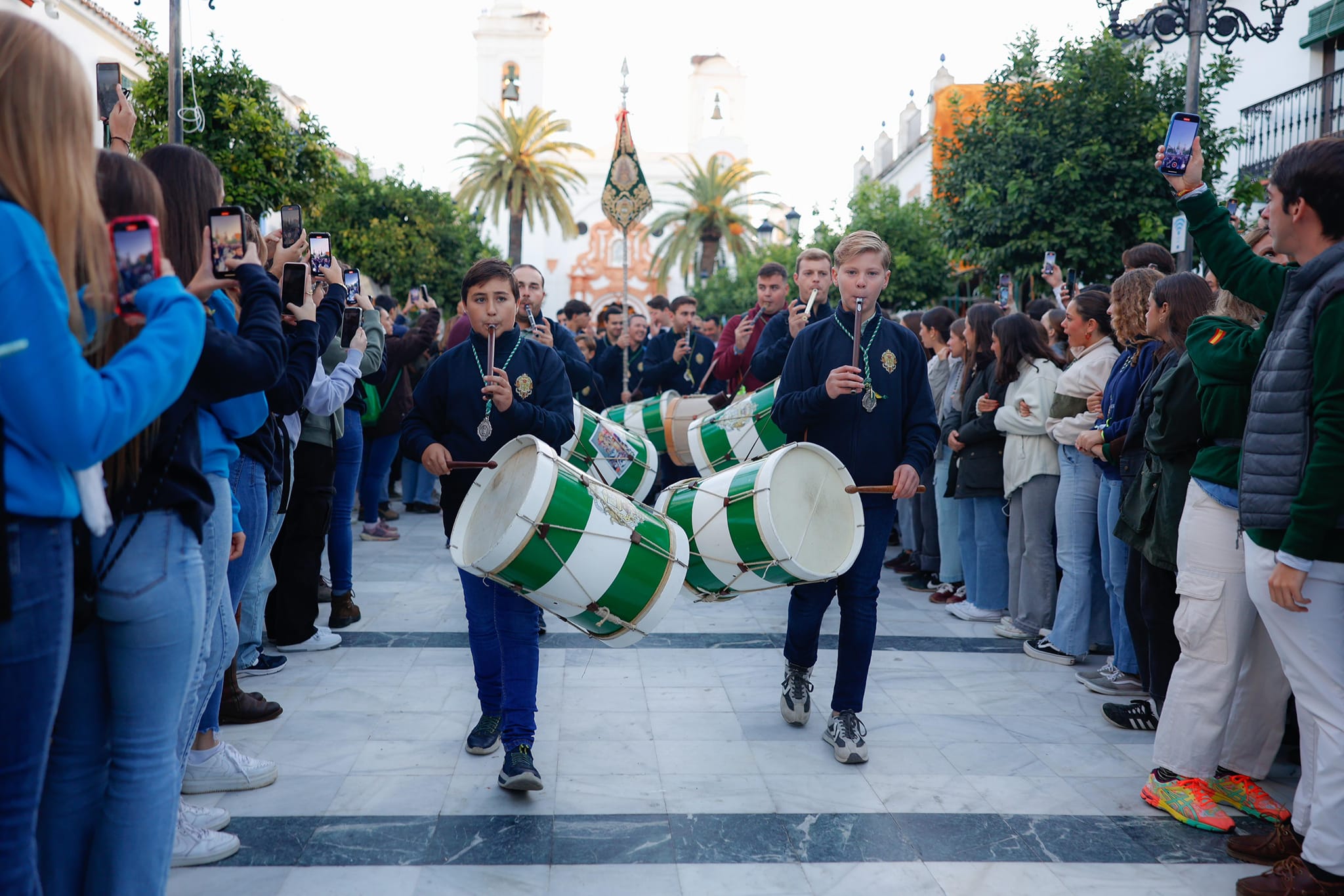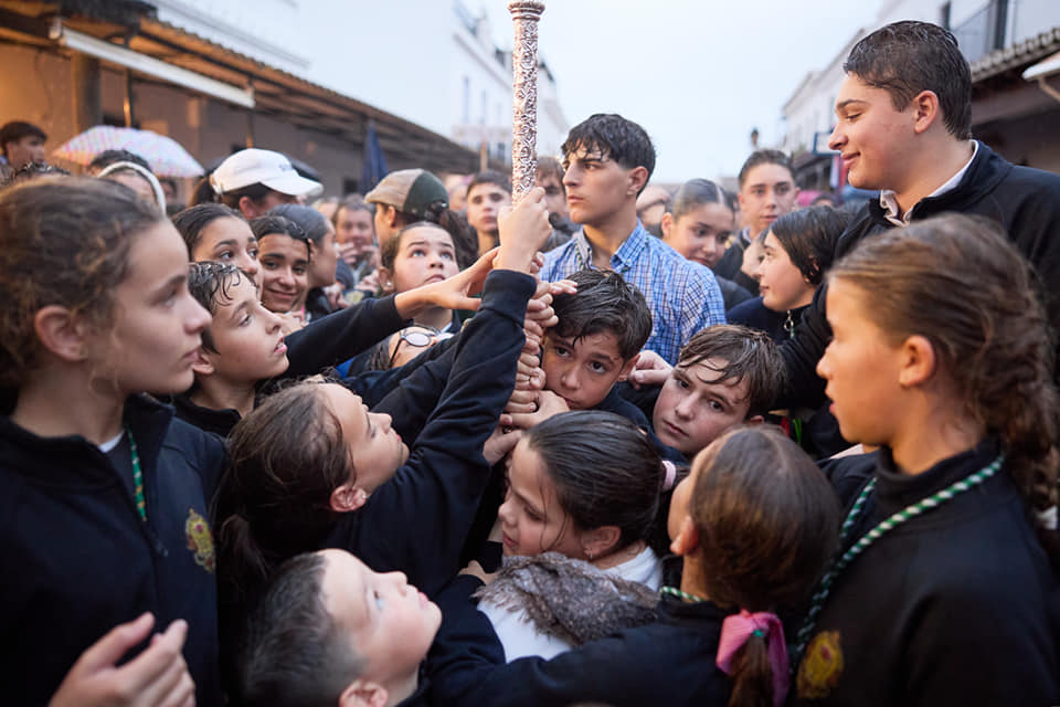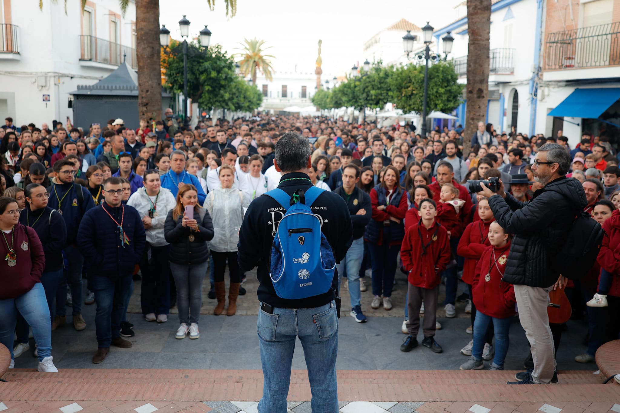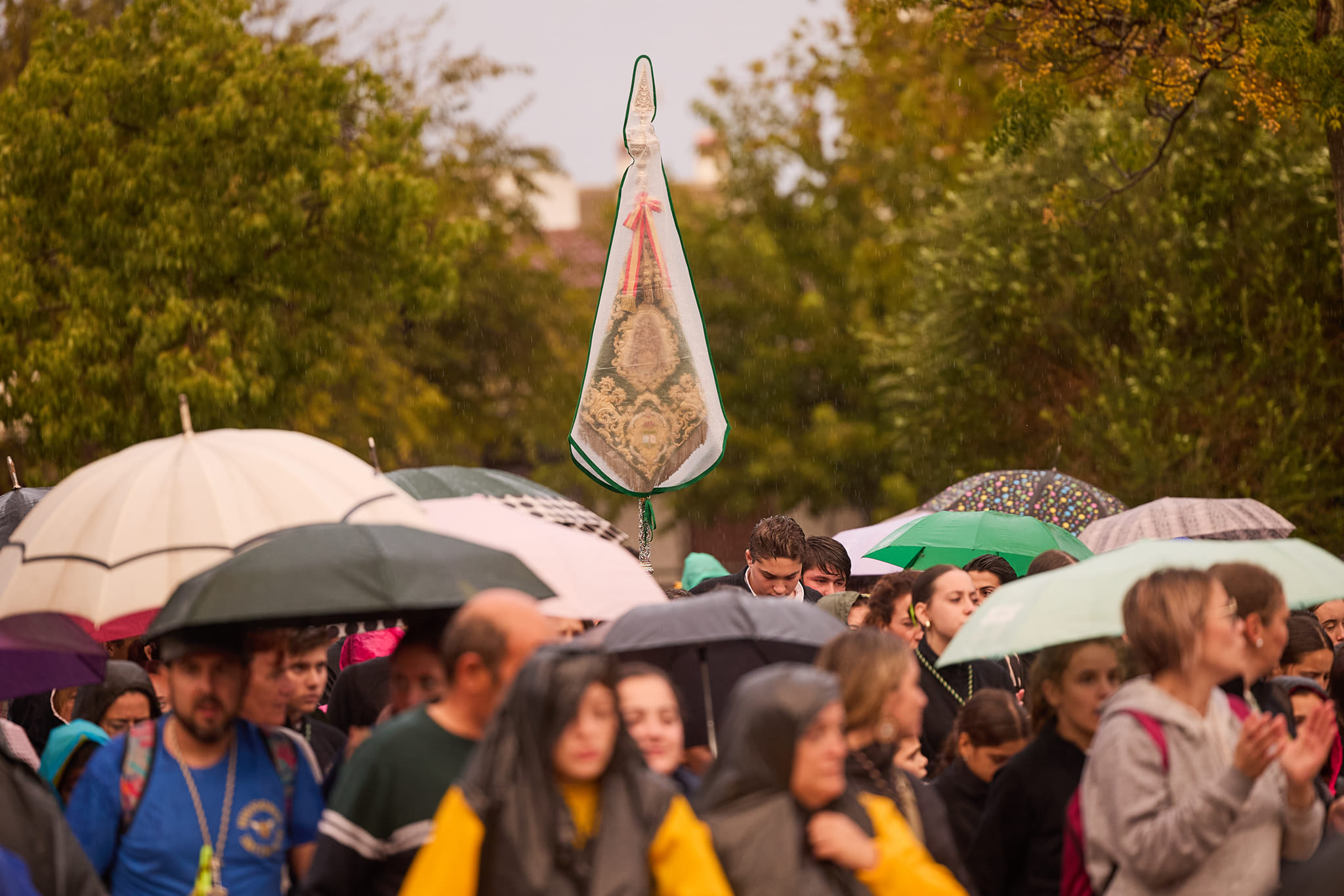 Las temperaturas fueron agradables durante todo el día y la lluvia no comenzó a aparecer levemente hasta la tarde. Sin embargo, en la entrada a la aldea las precipitaciones comenzaron a ser más intensas. A pesar de ello, los jóvenes avanzaban con más entusiasmo hasta las plantas de la Blanca Paloma, portando el guión de la Matriz que encabezaba la multitudinaria comitiva. Minutos antes de las 8 de la tarde, repicaban las campanas del Santuario marismeño anunciando la llegada, con la emoción y el júbilo de los participantes que llenaban por completo el templo.