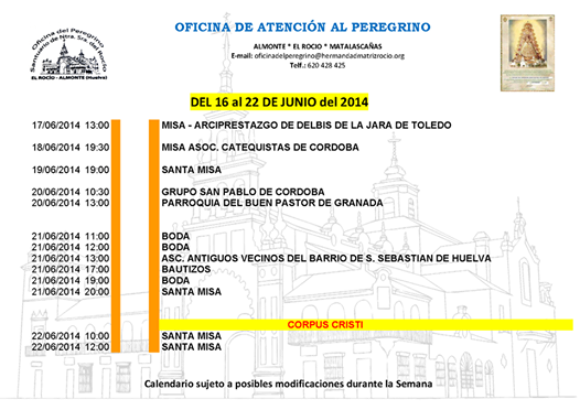 La Oficina de atención al peregrino nos facilita la Peregrinación semanal del Santuario del Rocío, del 16 al 22 de junio, sujeta a modificaciones de ultima hora. Destacamos la celebración del Corpus el domingo 22 de junio.