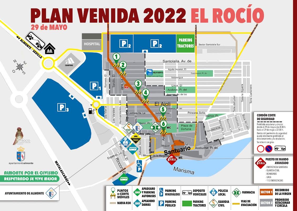 En El Rocío, quedará prohibido el estacionamiento y la circulación en el Sector 1 y en el Sector 2 desde el 29 de mayo a las 08:00 hasta las 22:00 de ese mismo día. Las bolsas de aparcamiento se habilitarán en las calles Romero, Santolalla, tras la gasolinera, junto a Camino Los Llanos tras R30 (tractores) y zona de Paseo Marismeño para personas con movilidad reducida. Estarán abiertas desde las 10:00 del 27 de mayo y hasta la finalización de la romería. El apeadero de autobuses se emplazará junto a la Jefatura de la Policía Local (Avenida de la Canaliega).