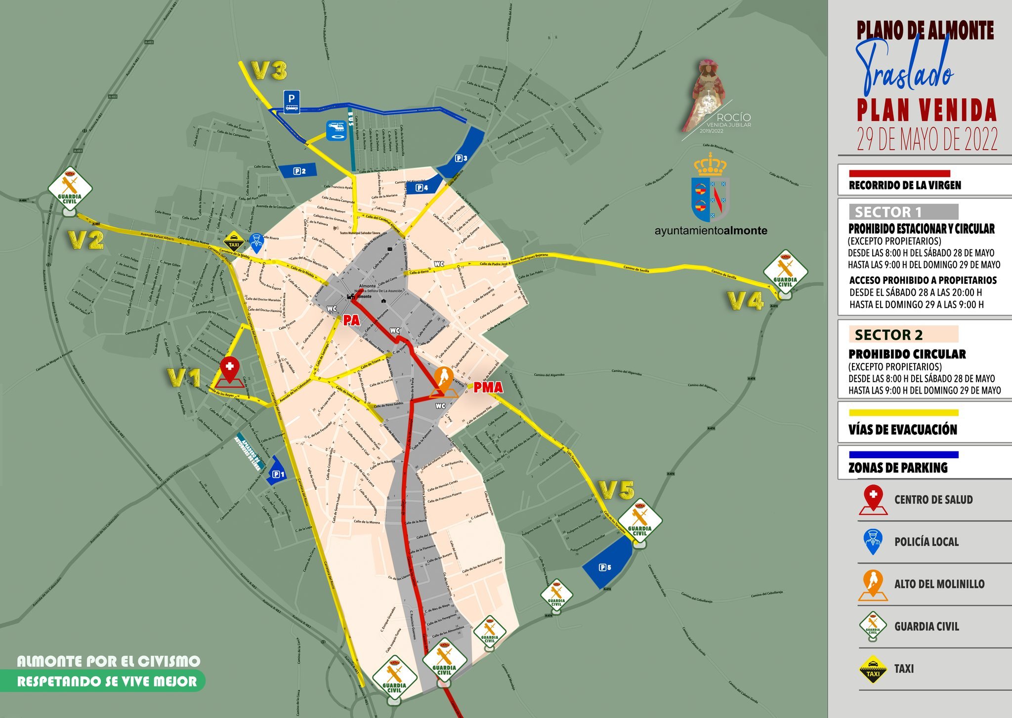 En Almonte quedará prohibido el estacionamiento y la circulación desde el 28 de mayo a las 08:00 hasta el 29 de mayo a las 09:00 por todo el recorrido de la Virgen (Sector1). Los vecinos que tengan su residencia en el sector 1 podrán acceder a sus garajes hasta las 20:00 del día 28 presentando su DNI y tarjeta de residente expedida por el Ayuntamiento.