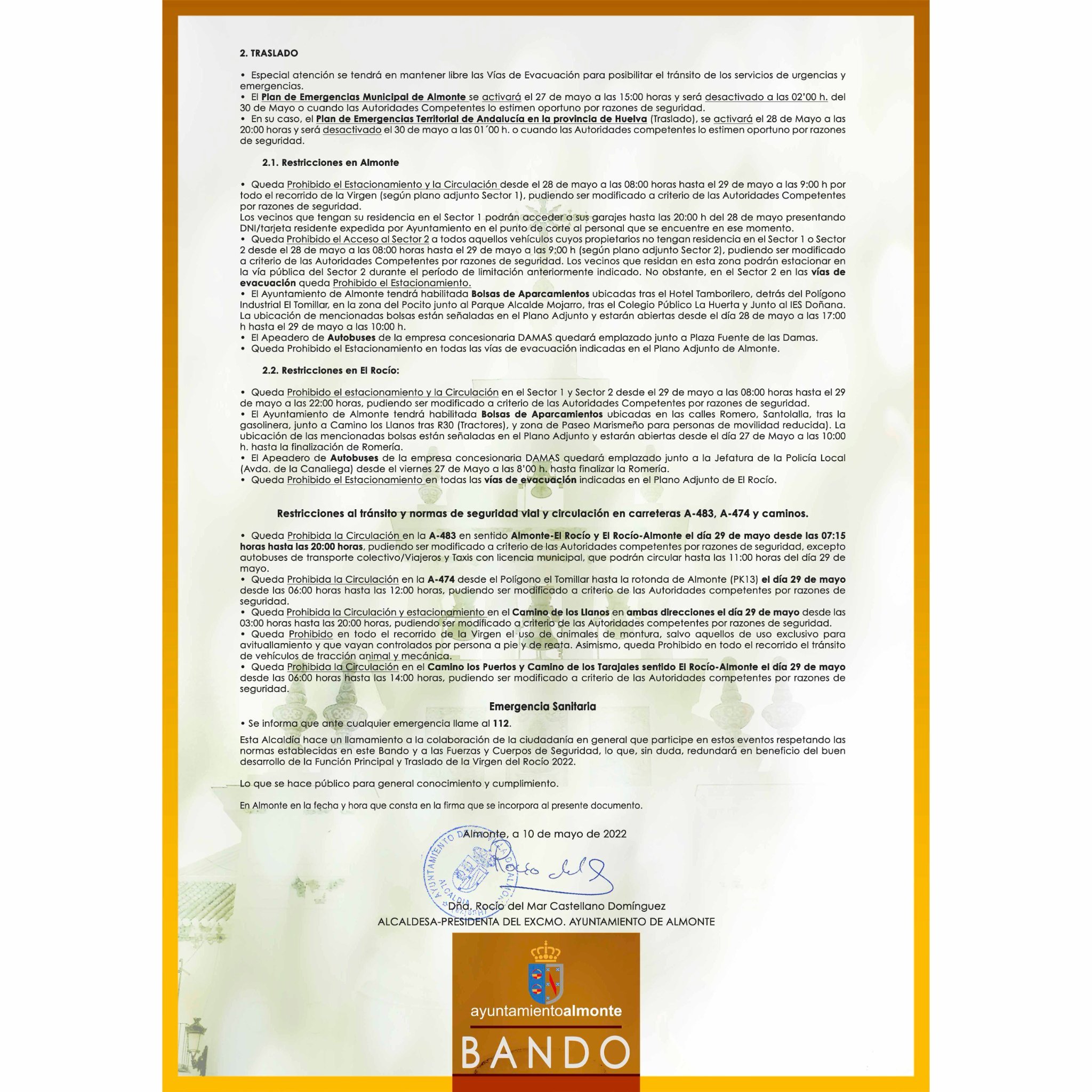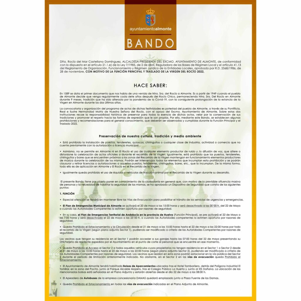 El bando distingue entre las restricciones de Almonte y las de El Rocío, igualmente se establece un Sector 1 para el recorrido de la Virgen y un Sector 2 para las zonas aledañas.
