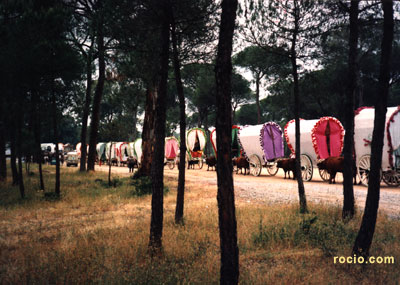El Rocío, Platero -le dije-; vamos a esperar las Carretas. Traen el rumor del lejano bosque de Doñana, el misterio del pinar de las ánimas, la frescura de la Madres y de los dos Fresnos, el olor de la Rocina…