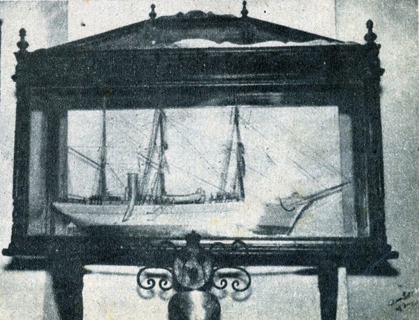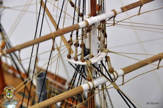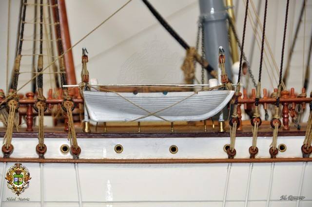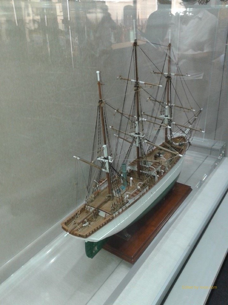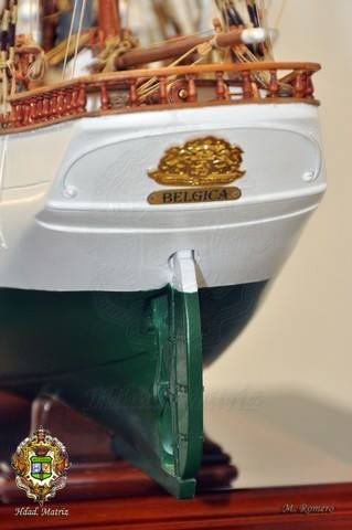Con el mimo que da la impronta de artista más aproximadamente unas 1.200 horas de trabajo, Benjumea ha conseguido devolver su esplendor a la maqueta escala 1:36 de aquella Corbeta “Belgique” que en 1884, año de sus construcción en Svelvik (Noruega), comenzara su andadura por los mares como ballenero bajo el nombre original de “Patria”; fuera posteriormente la primera en surcar los mares de la Antártida (1897-1899) ya bajo el nombre “Belgique” y realizara numerosas expediciones científicas a ambos Polos hasta 1916; fuera nuevamente bautizado como “Isfjord”, operando como buque de pasajeros; sirviera como empresa de procesamiento de pescado flotante (1918), otra vez como “Belgique” y terminara sus días, previamente desarbolado, como polvorín flotante de las Tropas Aliadas (británicas en este caso) en la II WW, siendo hundido por los daños colaterales de un bombardeo alemán cerca de la localidad de Harstad (Noruega) el 19 de Mayo de 1940.