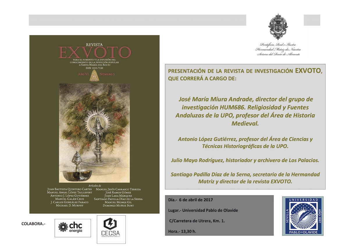 Hoy jueves 6 de abril se presenta la Revista de investigación «EXVOTO-V» en la Universidad Pablo Olavide de Sevilla a las 13,30 horas