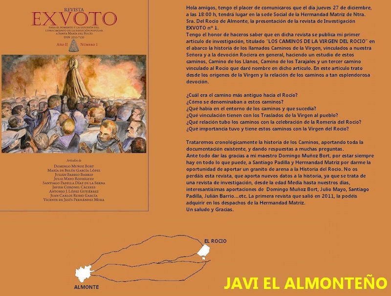 Nuestro buen amigo y miembro del foro del rocío, «Javi El almonteño», nos envía la noticia de la presentación en Almonte del nº 1 año II de la revista «Exvoto» que tendrá lugar en la sede de la Hdad. Matriz a las 18 horas del próximo día 27 de diciembre. Él participa con un artículo de investigación sobre los caminos de la Virgen que de seguro atraera la atención de todos.