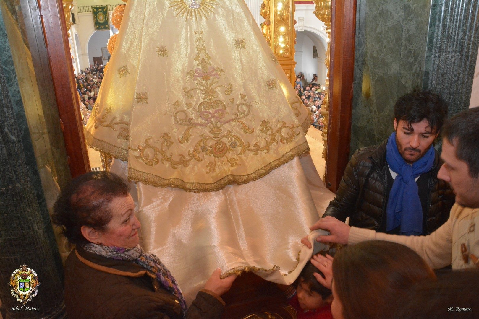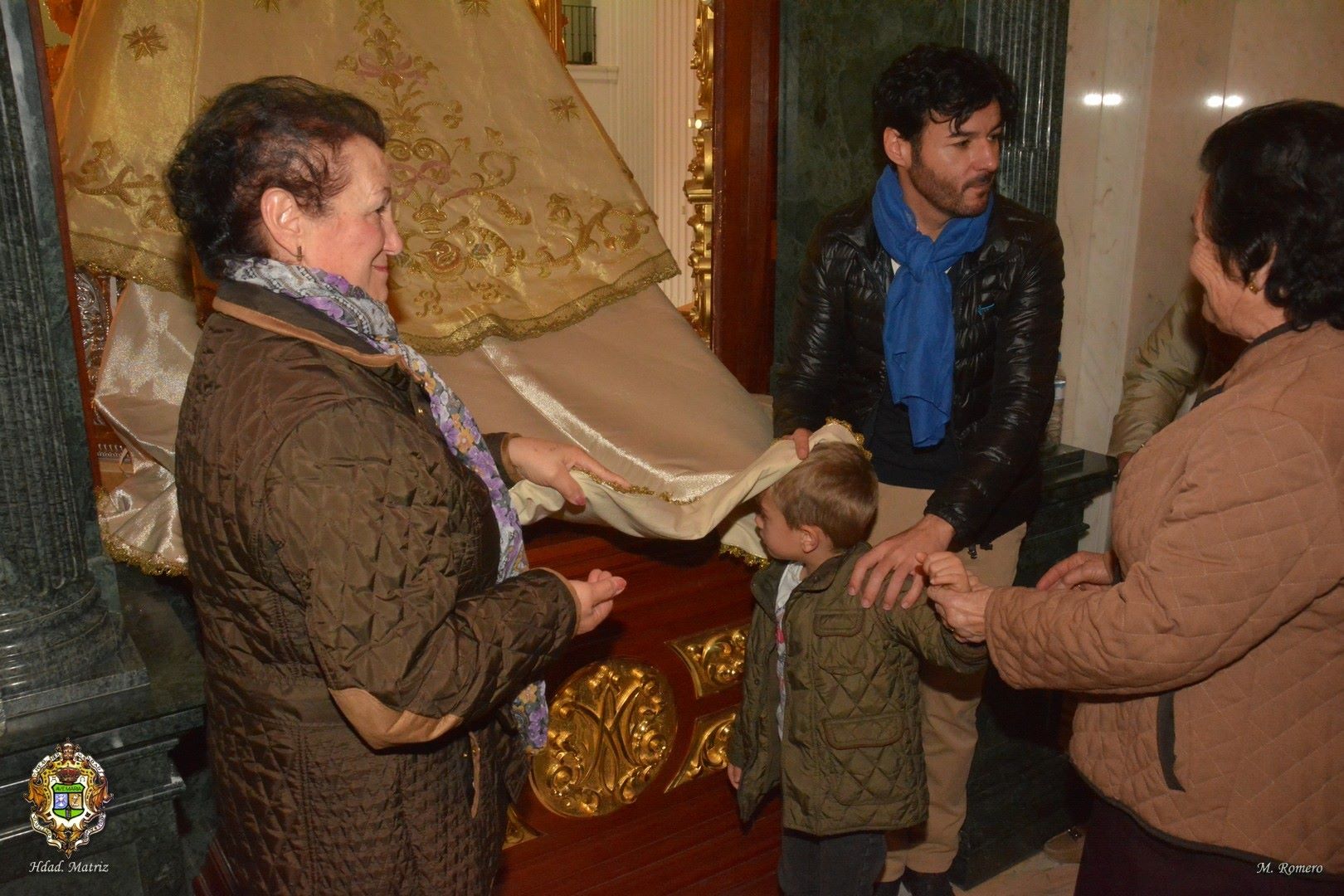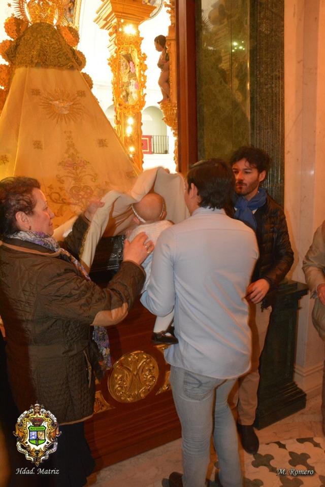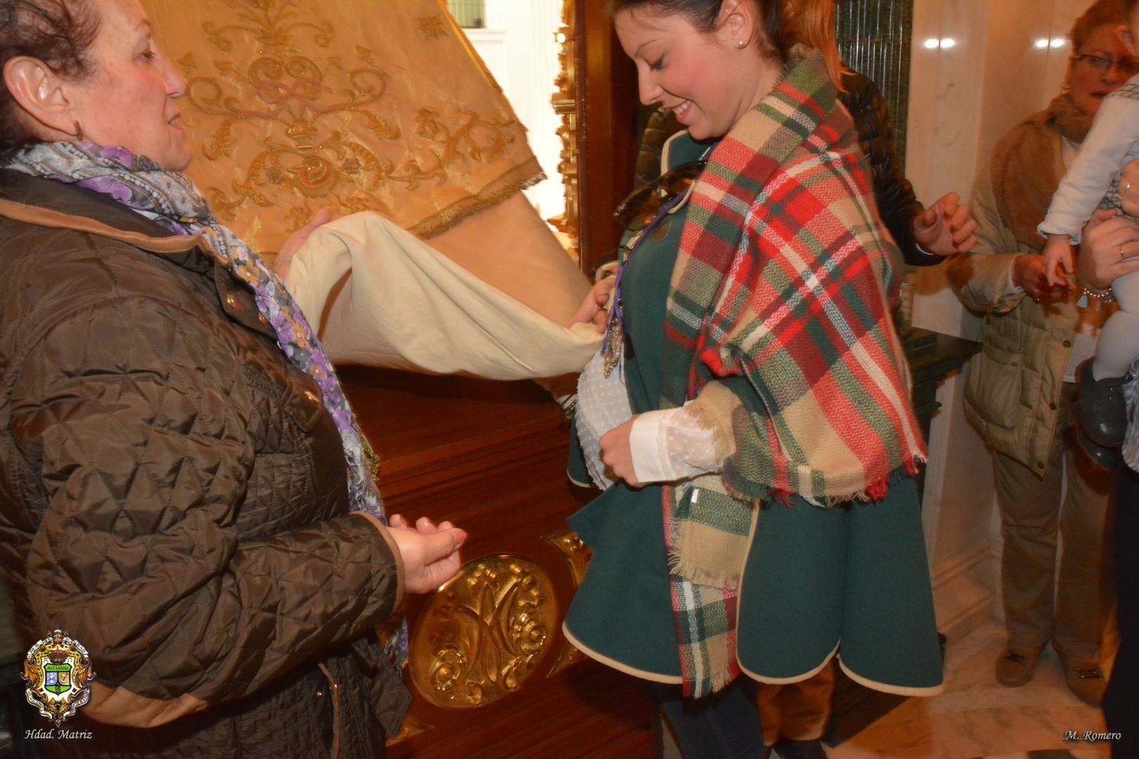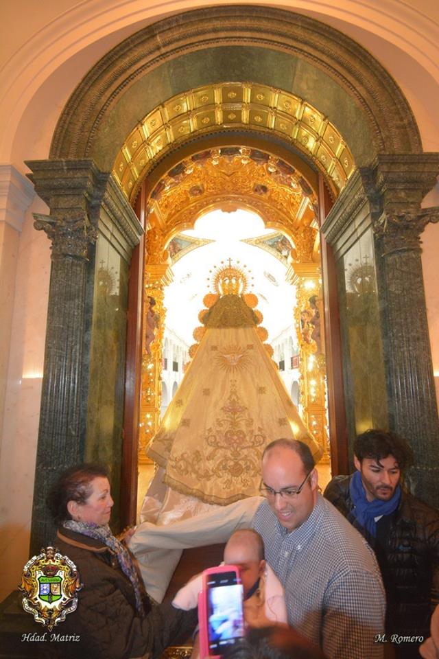 Tras la bienvenida y bendición por parte del Sr. Rector del Santuario, Rvdo. D. Francisco J. Martín Sirgo, los niños, acompañados por sus padres subieron al Camarín de Nuestra Señora, donde las Hermanas Camaristas les impusieron el manto y pudieron contemplar la belleza de la Señora, reflejada en los sendos espejos que permiten una visión de tan Sereno Perfil.