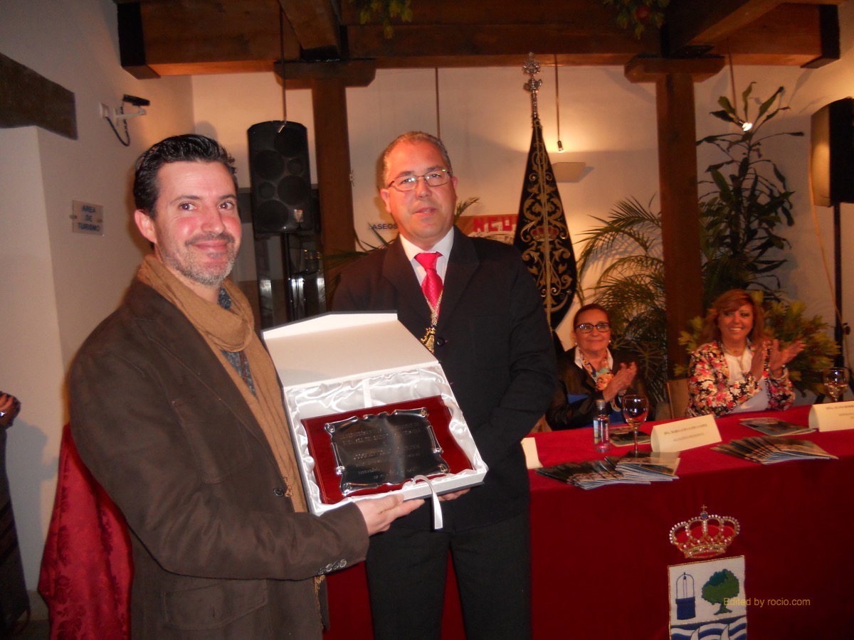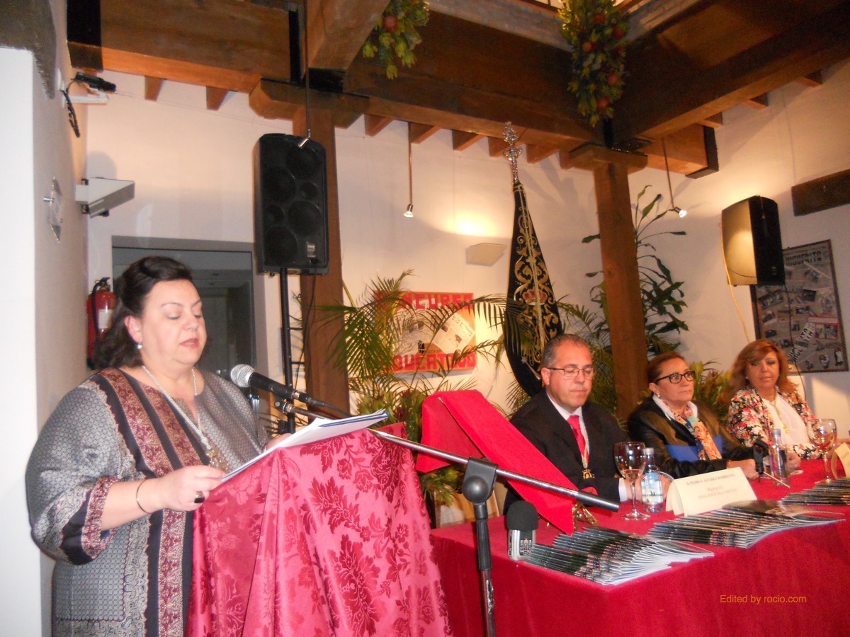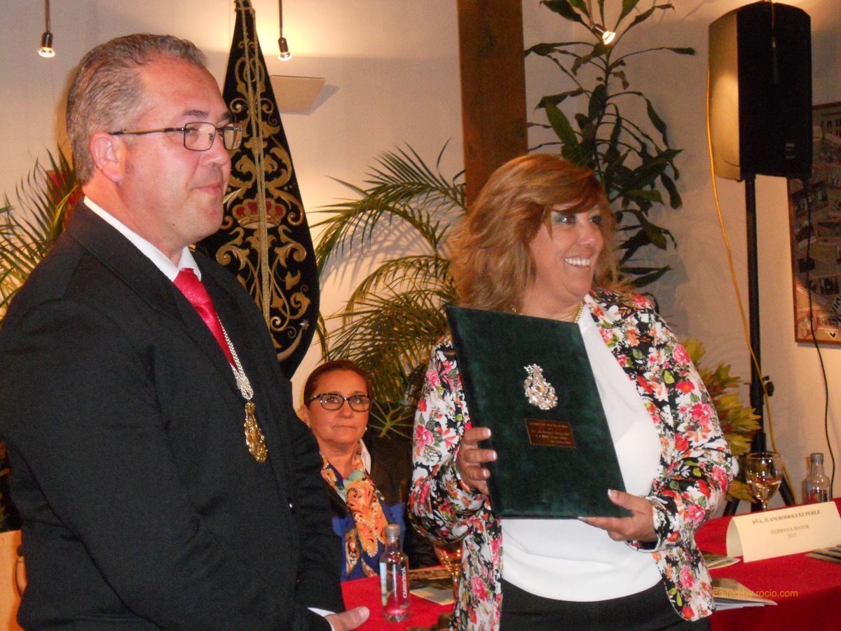 Seguidamente, el Presidente hizo entrega de las Pastas del Pregón a la Hermana Mayor, Juani Rodríguez, que las recogía en nombre del Pregonero José Fernando Mendoza Real que, por motivos de enfermedad, no pudo estar presente en el acto, por lo que la Hermana Mayor agradeció, en su nombre, la oportunidad que le da la Hermandad de abrir su corazón y pregonar a la Madre de los rocieros.