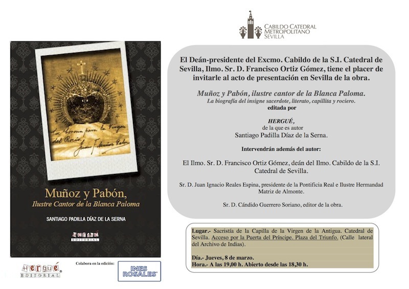 En la Sacristía de la Capilla de la Virgen de la Antigua de la Catedral de Sevilla se ha presentado el libro: «Muñoz y Pabón, ilustre cantor de la Blanca Paloma» por su autor, Santiago Padilla. En el acto han intervenido en primer lugar El Ilmo. Sr. D. Francisco Ortiz Gómez, deán del Ilmo. Cabildo de la S.I. Catedral de Sevilla, el autor del libro, Santiago Padilla Díaz de la Serna y por último el Presidente de la Hdad. Matriz, Juan Ignacio Reales Espina, que ha elogiado la magnífica labor desarrollada por Santiago en esta y en anteriores publicaciones. A continuación ponemos un interesante archivo sonoro con las diferentes intervenciones.