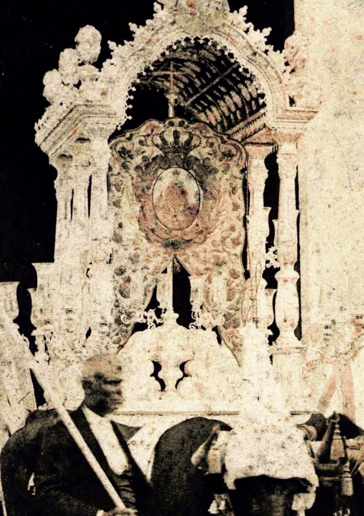 En su parte frontal, la carreta quedaba rematada por un escudo sobredorado de los Montpensier, por lo que terminó identificándose popularmente como si la casa ducal hubiese patrocinado la totalidad de los gastos. Los primeros años, el templete daba cobertura al Simpecado blanco que se había estrenado en 1855, con ocasión de la proclamación del dogma concepcionsta del año anterior, en cuyo proyecto se involucró muy activamente el cura, don Joaquín Cortines, capellán, director espiritual hermano mayor de esta hermandad rociera durante la segunda mitad de la centuria decimonónica.