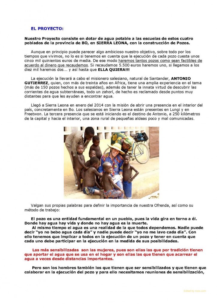 Ya tenemos la primera Propuesta para nuestra Ofrenda del Foro del año 2015. El ponente es Jesús Fernández Lorenzio (Argaijo). Como siempre Jesús se vuelca con nuestra Ofrenda y ha querido dejar su propuesta para la consideración del Foro consistente en la construcción de unos pozos en Sierra Leona para dotar de agua potable a las escuelas de 4 pueblos en la provincia de BO en donde el misionero salesiano, Antonio Gutierrez, ejerce su labor pastoral.