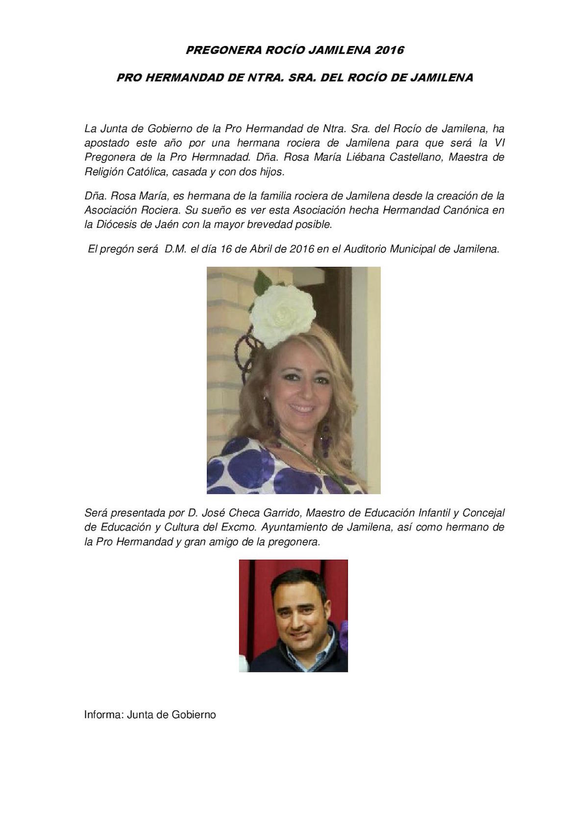 La Junta de Gobierno de la Pro Hermandad de Ntra. Sra. del Rocío de Jamilena ha designado a Dña. Rosa María Liébana Castellano para ser la Pregonera del Rocío de Jamilena para 2016.
