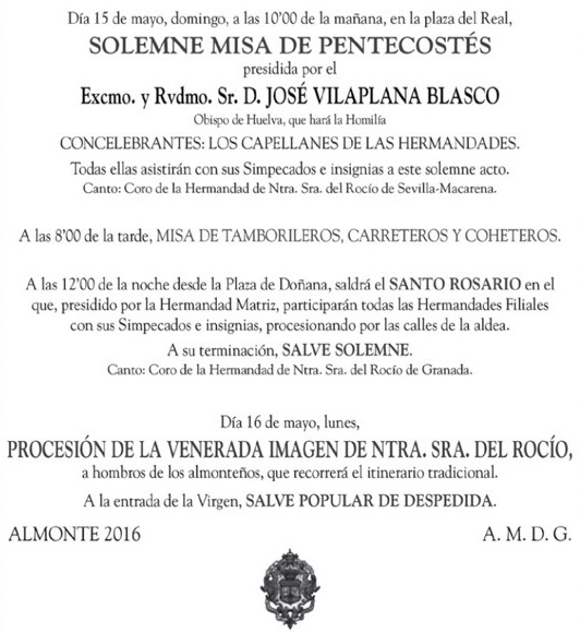 Emisión en Directo de la Misa de Pentecostés en el Rocío 2016 por Canal Sur. A partir de las 10 de la mañana del domingo 15 de mayo de 2016 se ha retransmitido la Misa de Pentecostés desde El Real del Rocío.