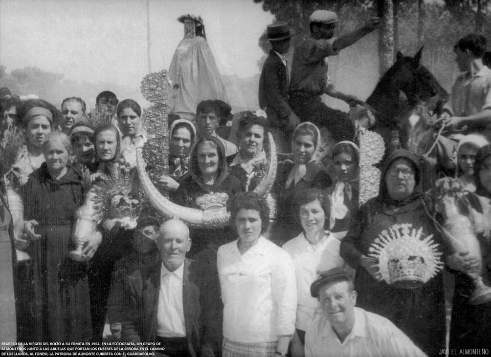 En la fotografía, un grupo de almonteños junto a las abuelas que portan los enseres de la Señora en el camino de Los Llanos. Al fodo La Virgen cubierta con el guardapolvo del camino.