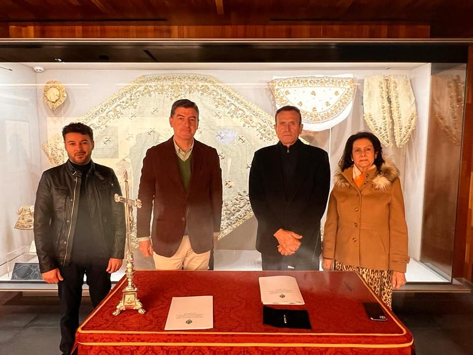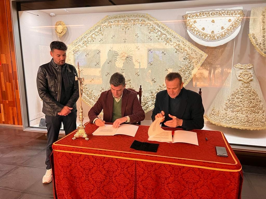 Esta tarde, día 17de febrero 2023, en el Tesoro de la Hermandad Matriz, se ha firmado el acuerdo por el que D. Victoriano Camacho Martínez y su familia sufragará el coste de la restauración y limpieza del conjunto textil de Los Montpensier.