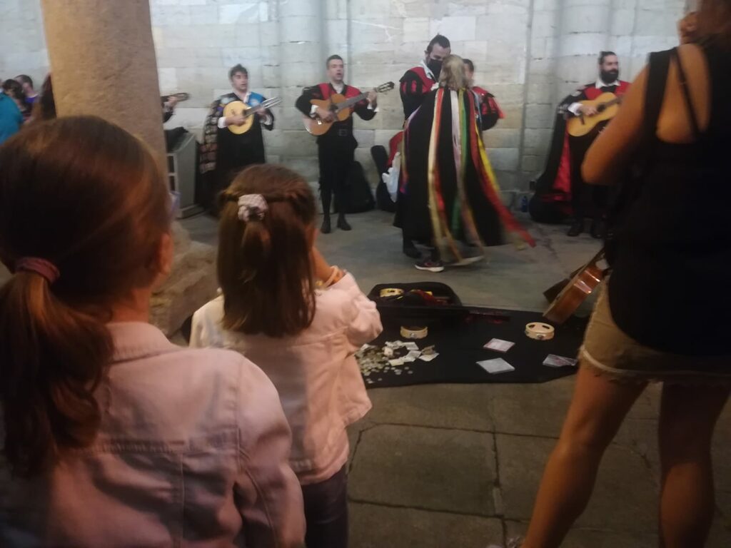 A esta hora, 26 de agosto de 2021 a las 23,30 horas, en los soportales de la presidencia de la Xunta de Galicia en la plaza del Obradoiro, la tuna de Derecho ameniza la noche compostelana con su espléndido repertorio tradicional en medio de bromas y chascarrillos.