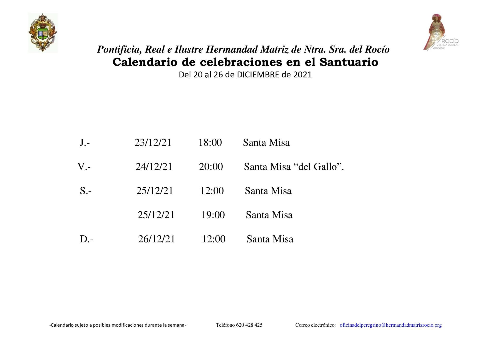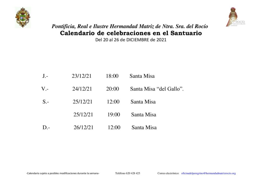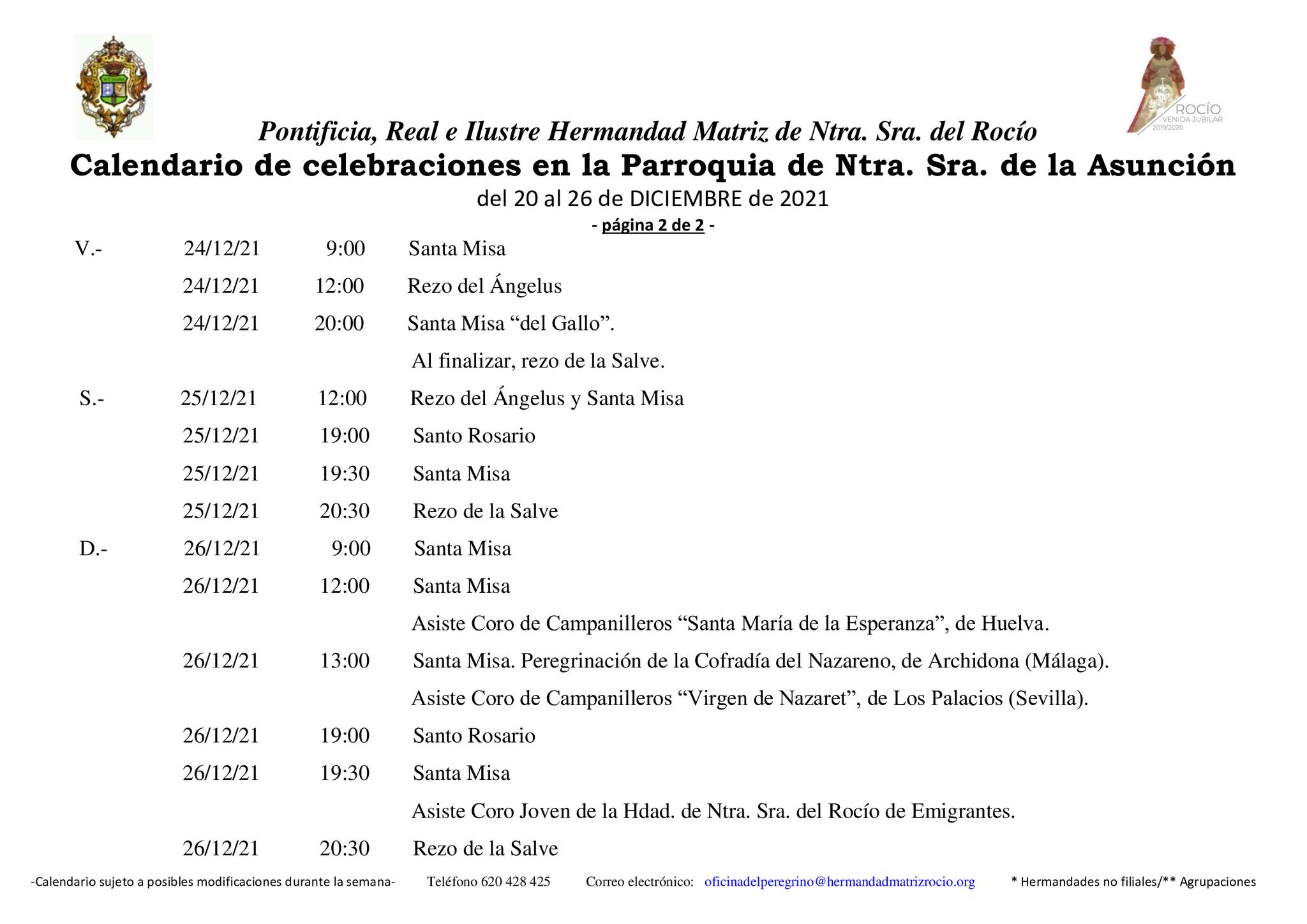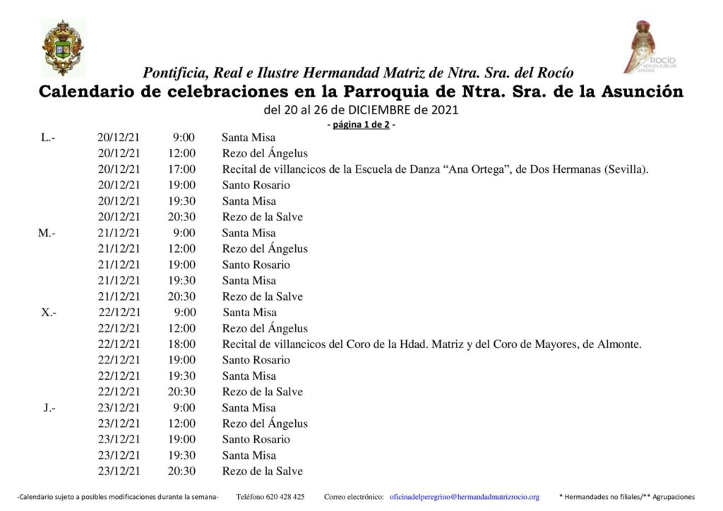 Calendario de celebraciones para la semana del 20 al 26 de diciembre, en la Parroquia de Ntra. Sra. de la Asunción y en el Santuario de Ntra. Sra. del Rocío.
