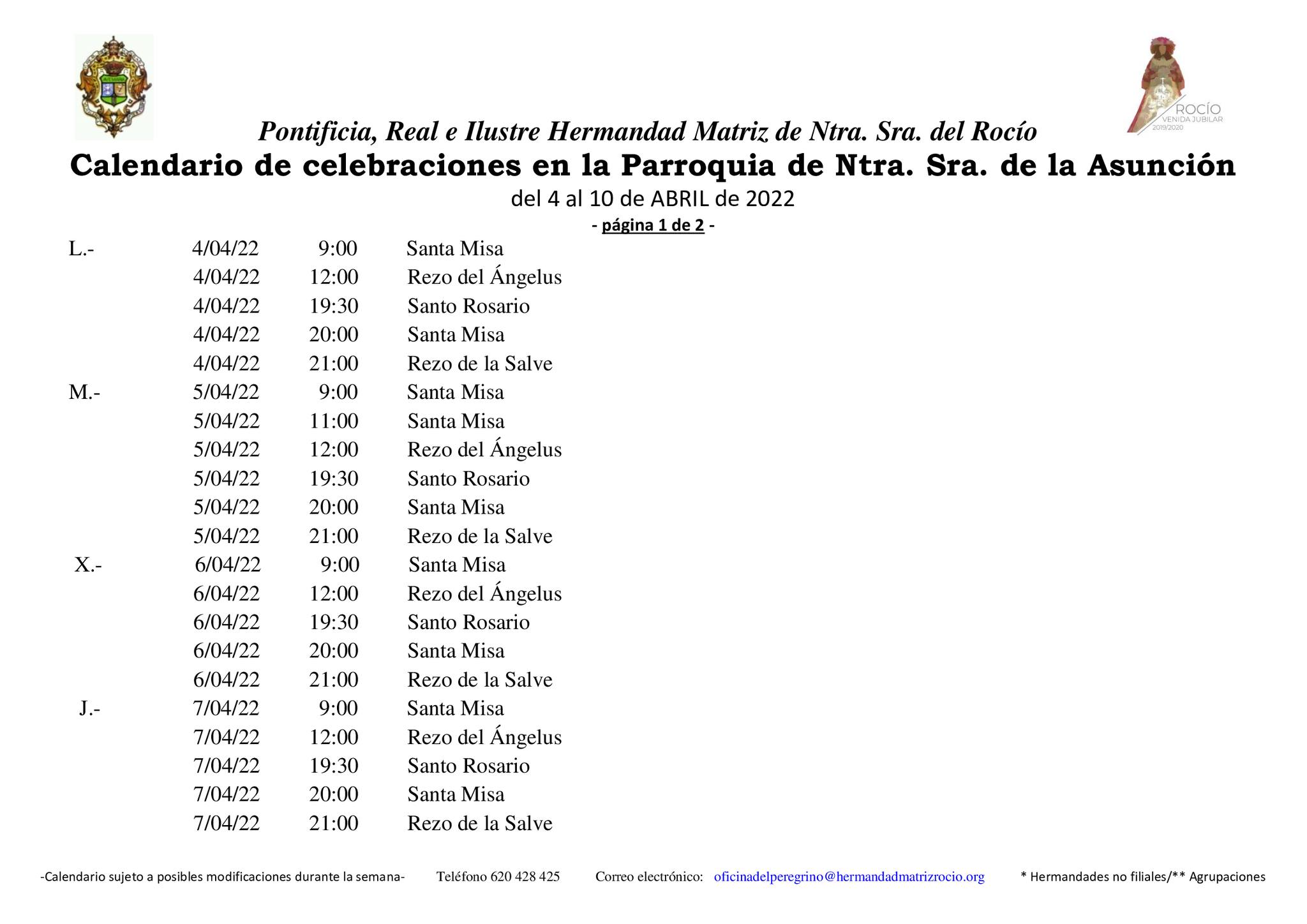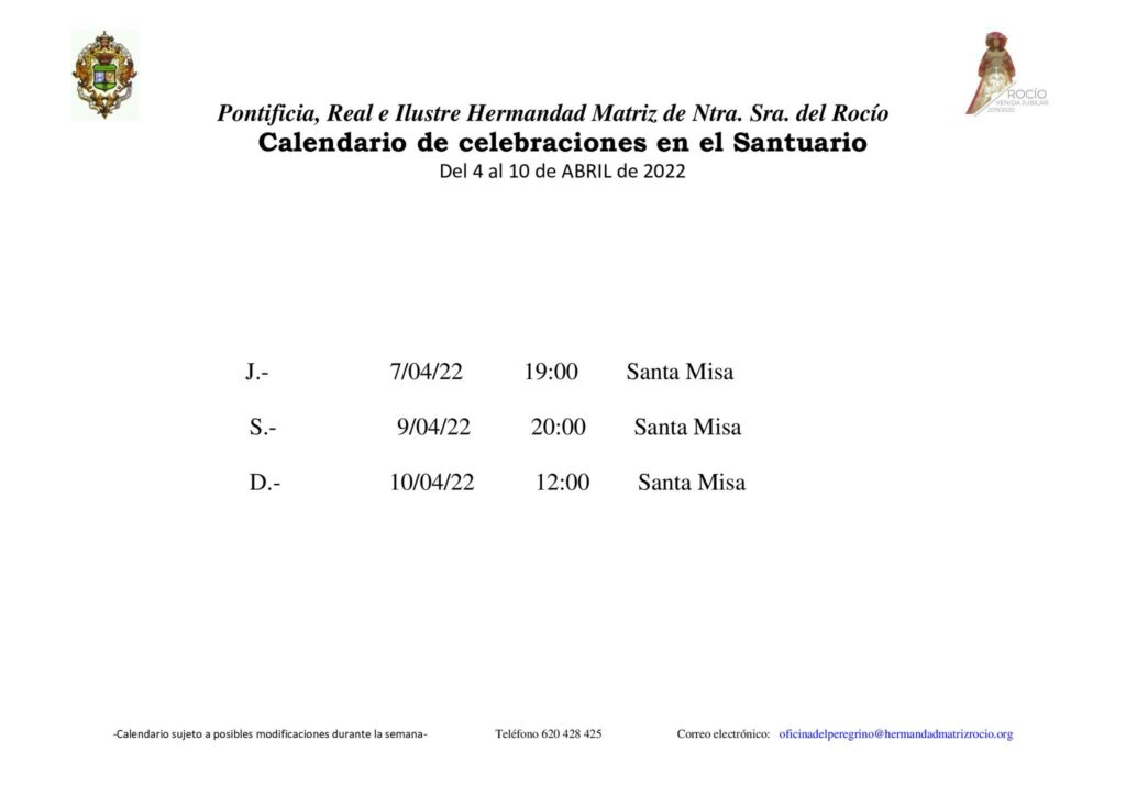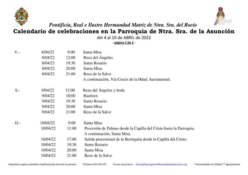 Calendario de celebraciones para la semana del 4 al 10 de abril, en la Parroquia de Ntra. Sra. de la Asunción y en el Santuario de Ntra. Sra. del Rocío.