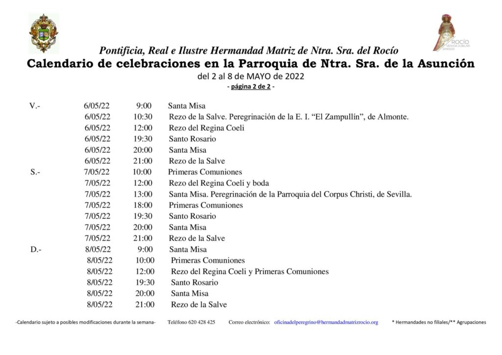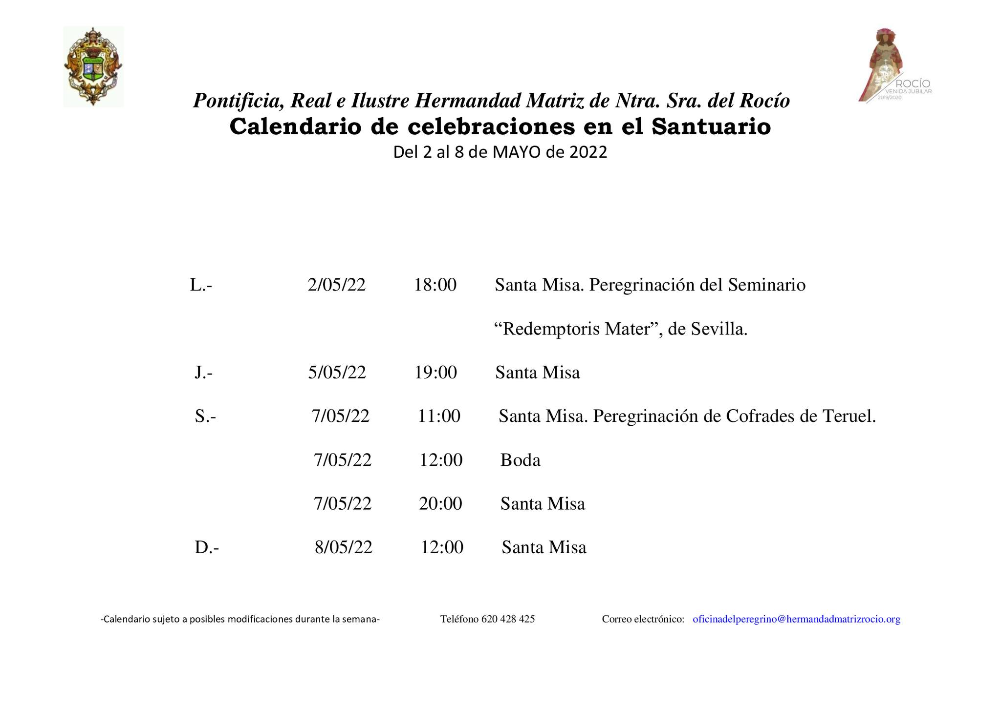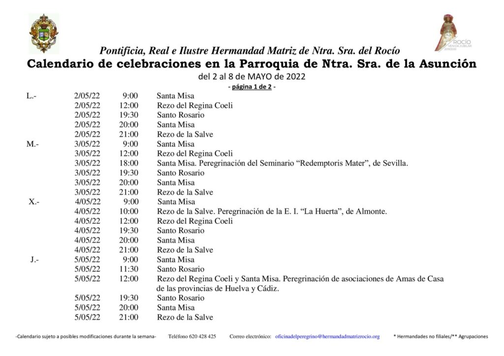 Rocío – Calendario de Celebraciones en la semana del 2 al 8 de mayo de 2022