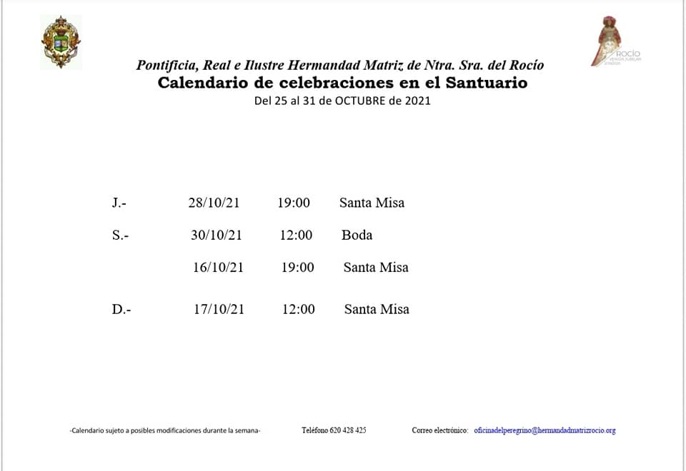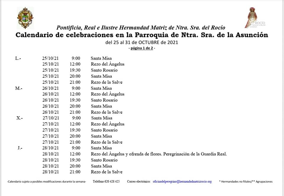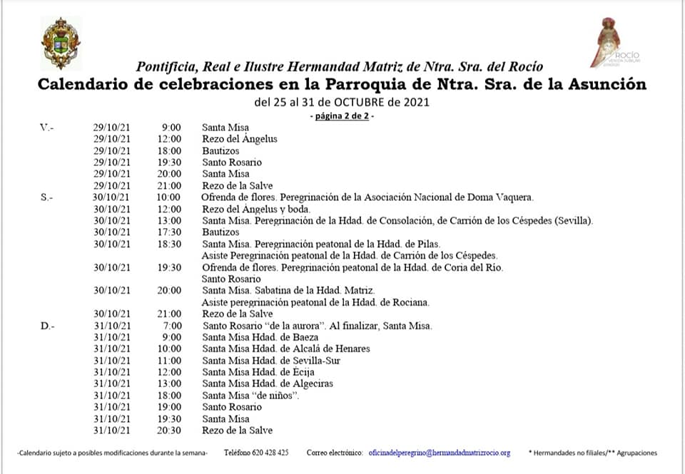Calendario de celebraciones para la semana del 25 al 31 de octubre, en la Parroquia de Ntra. Sra. de la Asunción y en el Santuario de Ntra. Sra. del Rocío.