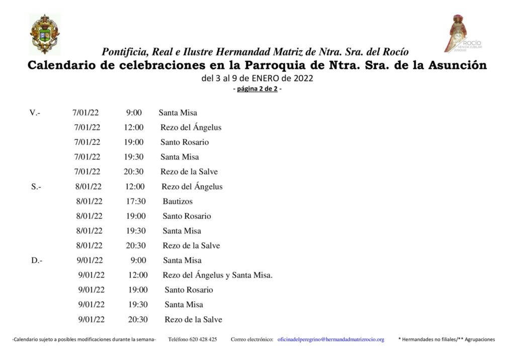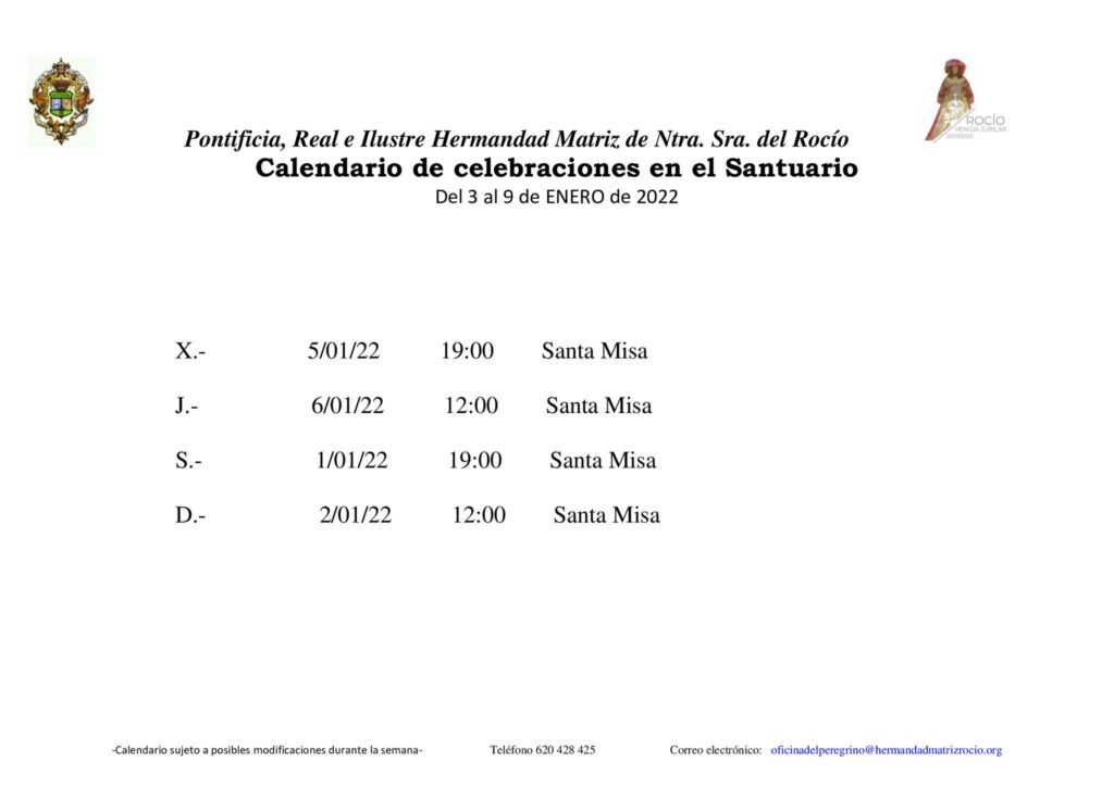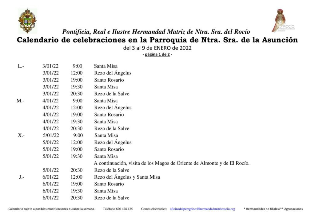 Calendario de celebraciones para la semana del 3 al 9 de enero, en la Parroquia de Ntra. Sra. de la Asunción y en el Santuario de Ntra. Sra. del Rocío.