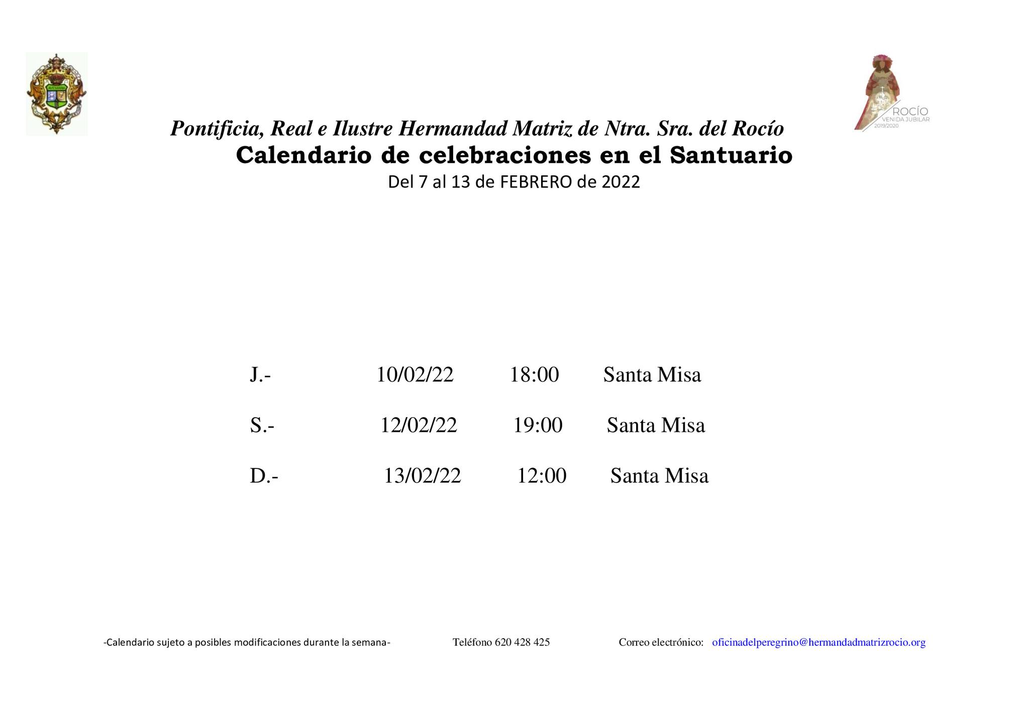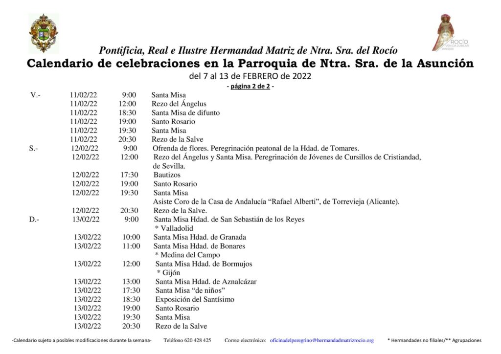 Calendario de celebraciones para la semana del 7 al 13 de febrero, en la Parroquia de Ntra. Sra. de la Asunción y en el Santuario de Ntra. Sra. del Rocío.