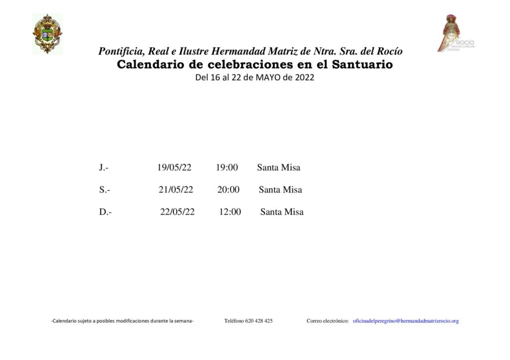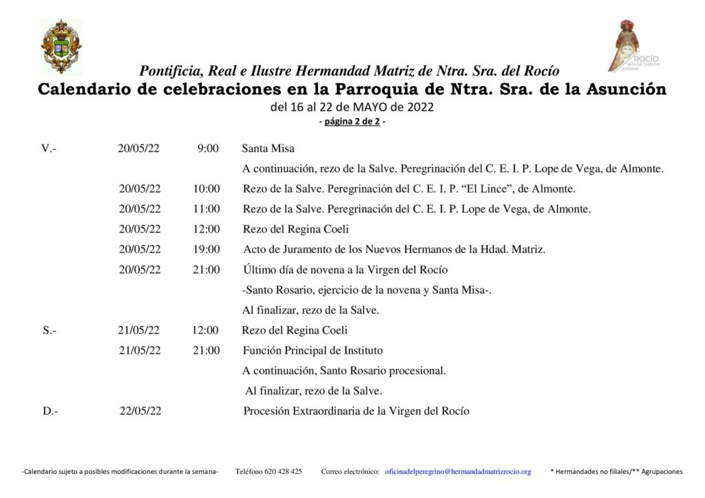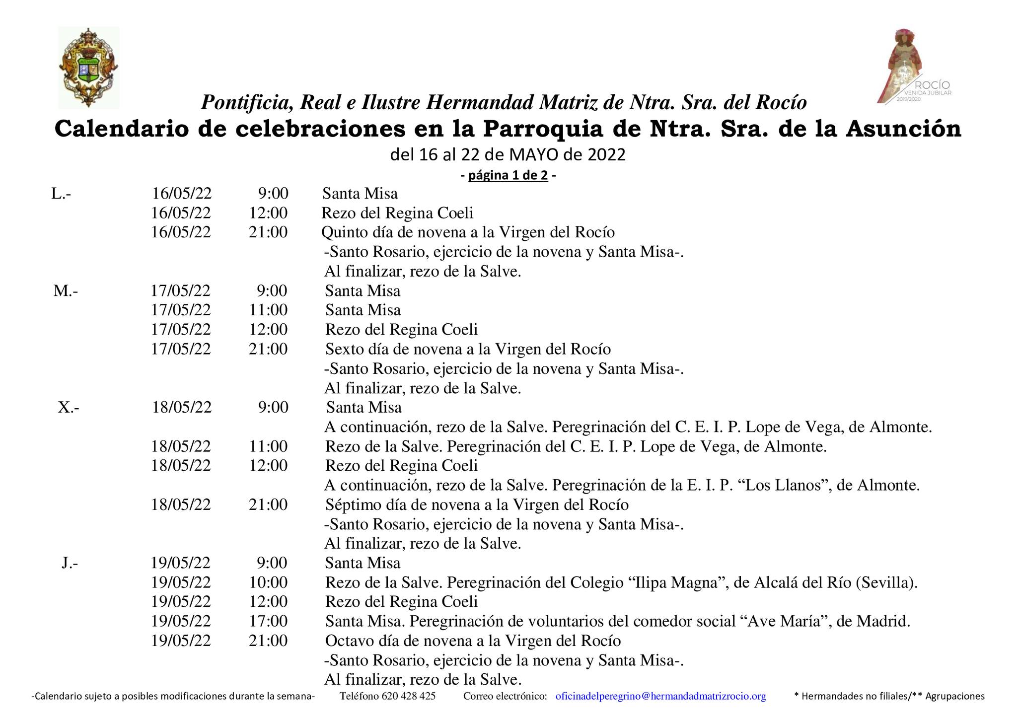 Calendario de celebraciones para la semana del 16 al 22 de mayo, en la Parroquia de Ntra. Sra. de la Asunción y en el Santuario de Ntra. Sra. del Rocío.