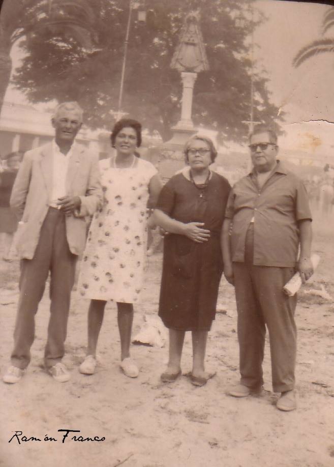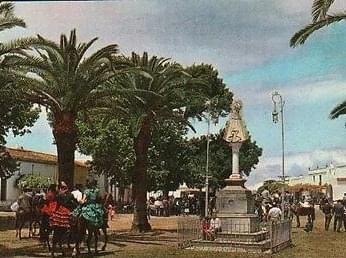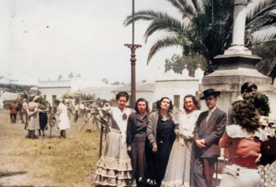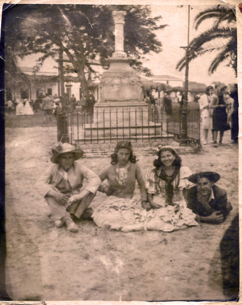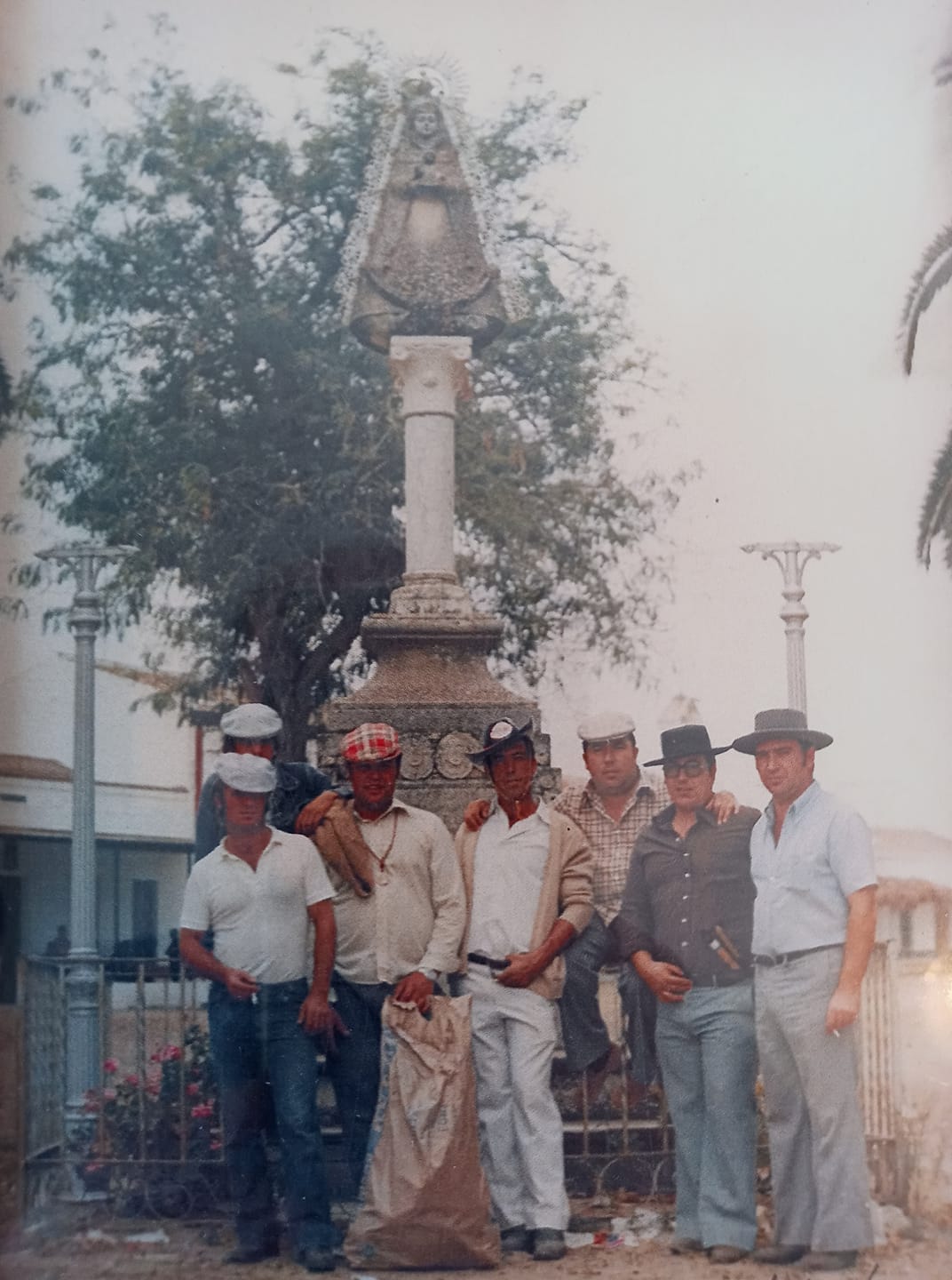 Retratistas, o también llamados minuteros (supongo por el tiempo en que tardaba en revelarse la fotografía) , que en número singular y durante la romería y días grandes aprovechaban el monumento para hacer fotografías.Mediados de los años 60, un par de matrimonios de Chucena posan ante monumento, los de la izquierda Rufino y Paca, y la pareja de la derecha, ambos con gafas, eran muy conocidos por regentar un kiosco en la Plaza, en un lateral del Ayuntamiento, Rosarito y Diego «Perico».Las fotografías son de Manuel Jaén y peregrinos de Benacazón, el año exacto no lo sé, podría ser, los comienzos de los años 60Las fotografías son de Manuel Jaén y peregrinos de Benacazón, el año exacto no lo sé, podría ser, los comienzos de los años 60.Grupo de rocieros de Aznalcázar tomada por lo años 70 durante la festividad del Rocío Chico. De izquierda a derecha: Andrés Ramírez Franco (Corní), detrás Juan Jiménez Barrera (que iba de cocinero del grupo), con la bolsa del pan Manuel Castaño Jurado (Taraba), Manuel Díaz Vargas (Tabique), Antonio Domínguez González (Pajito), con su gaita Miguel Suárez Díaz (Miguel tamborilero) y Antonio Japón Ramírez Cruzado (secretario de la hermandad). Sirva la fotografía como recuerdo a todos ellos, a la Hermandad del Rocío de Aznalcázar y a su historia. Fotografía propiedad de Josefi Jurado.