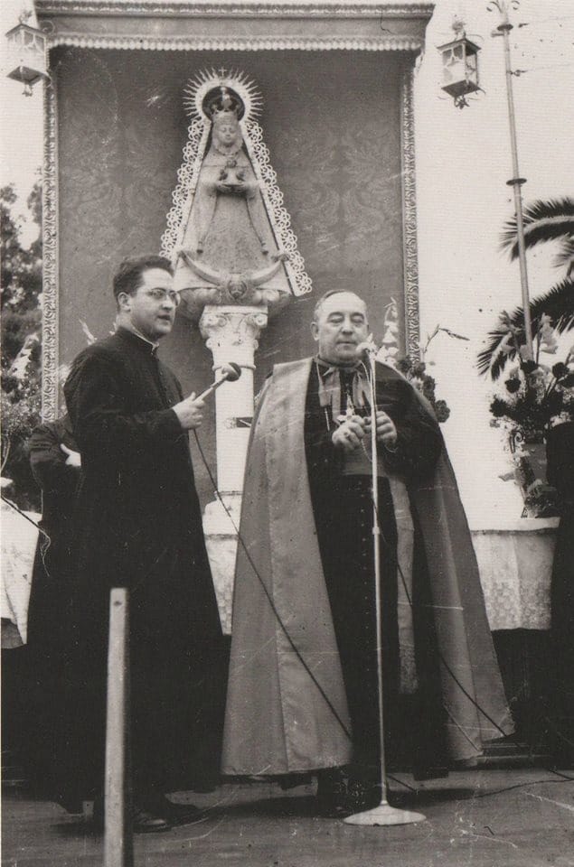 La fotografía es de 1959. El cardenal arzobispo de Sevilla, desde 1957 a 1982, José María Bueno Monreal, en la imagen, con su secretario, Manuel Pavón, ofició en la aldea, delante del Monumento de la Coronación Canónica, la misa Pontifical un 17 de mayo. Por entonces, se instalaba allí un altar para tan solemne celebración. Pepi Pérez Báñez.