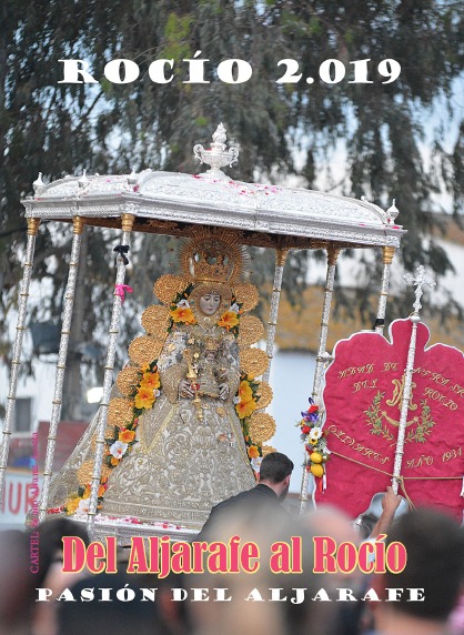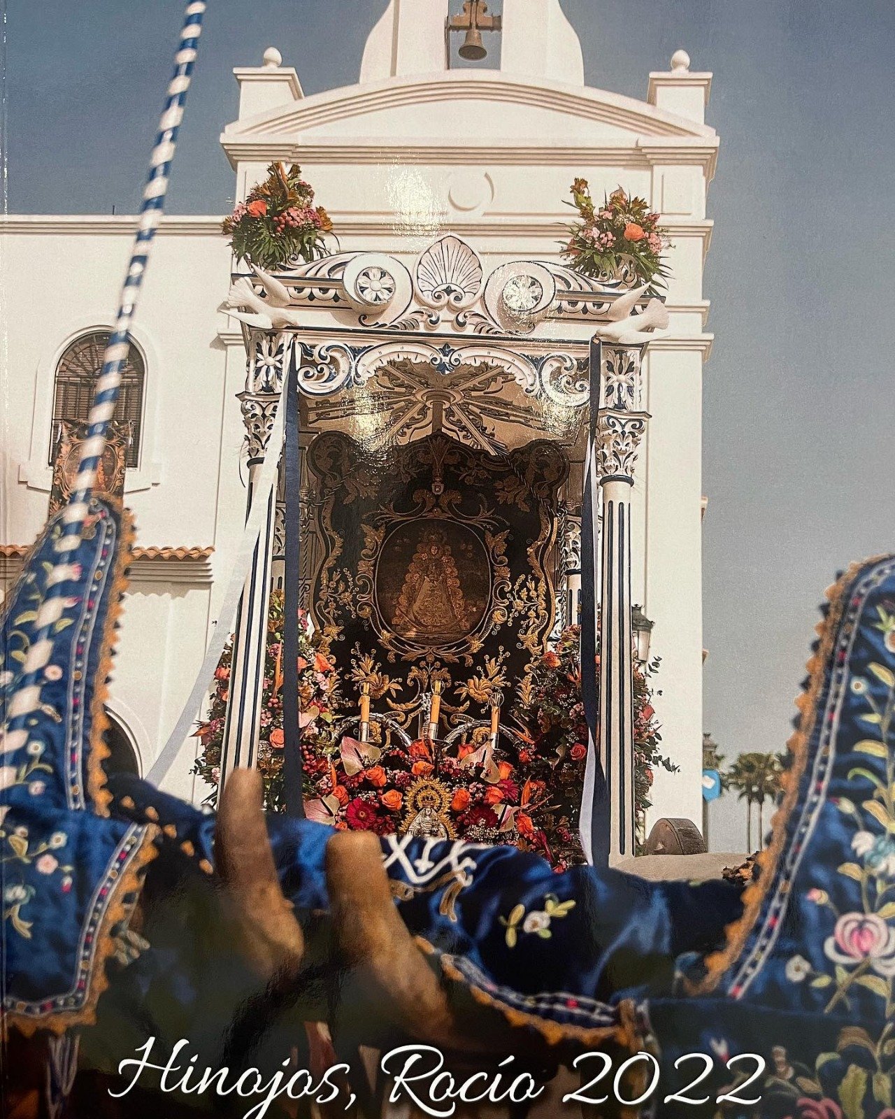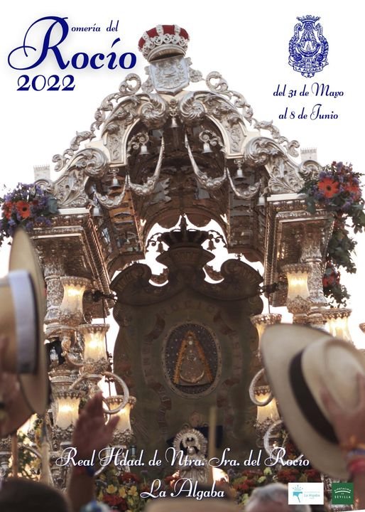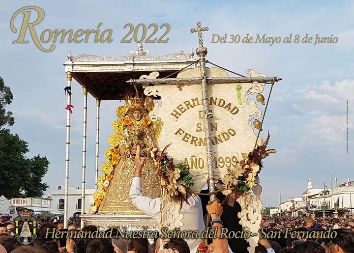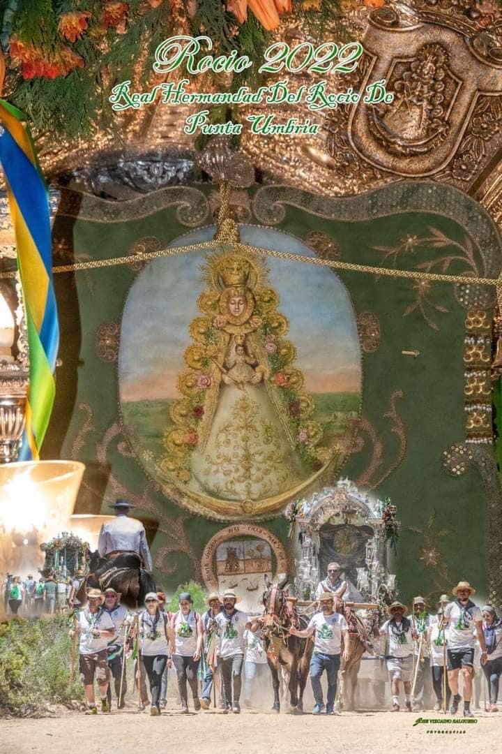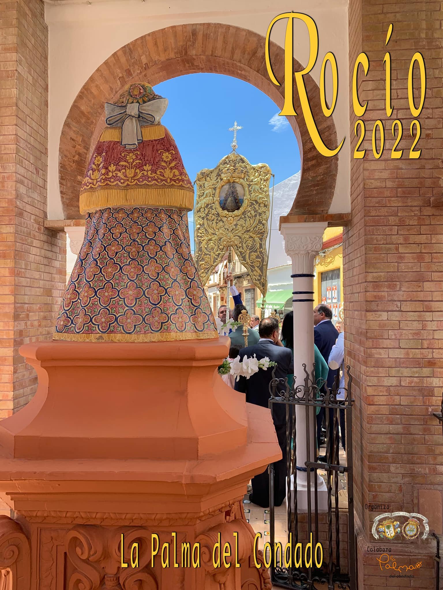 Flanquea a la Patrona de Almonte la mágica luz que desprenden las bengalas del Santo Rosario que antecede su salida triunfal, a hombros de los almonteños. Justo a sus plantas, la palabra “Romería”, esa que tanto anhelamos, contiene en cada letra escenas de la misma: el simpecado de la Matriz a caballo, el discurrir de las carretas, los peregrinos, los sones de los tamborileros, el monumento del Real del Rocío y el Santuario.