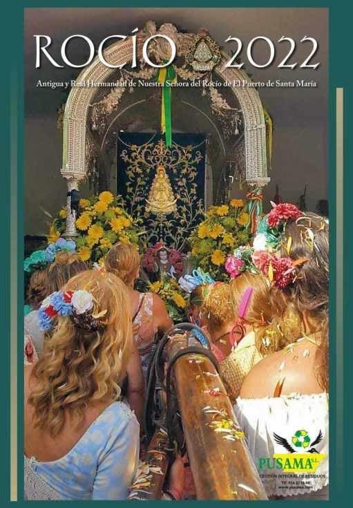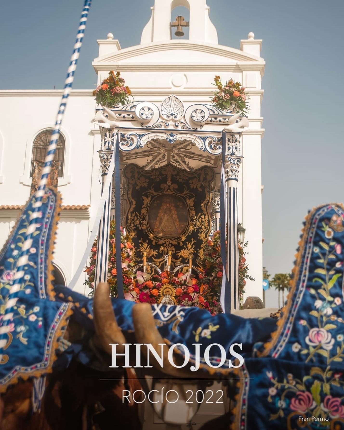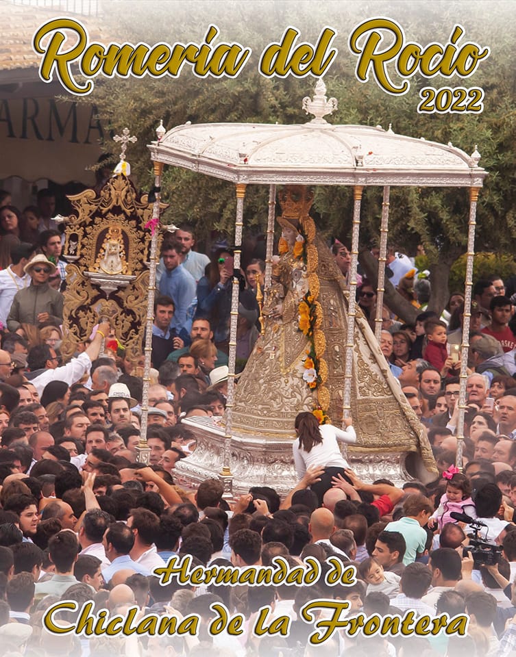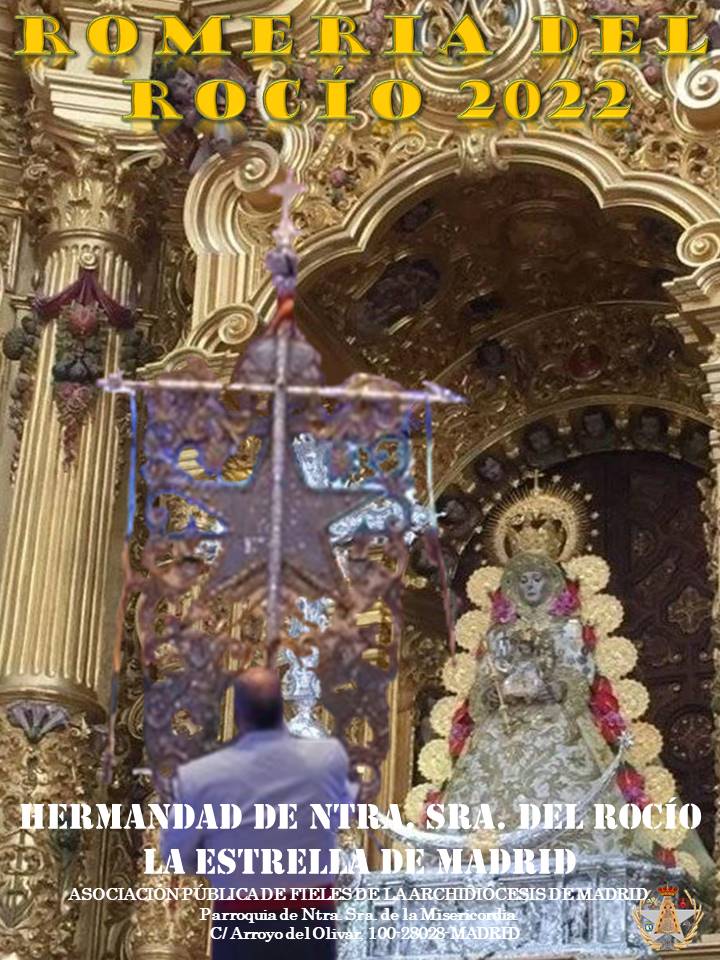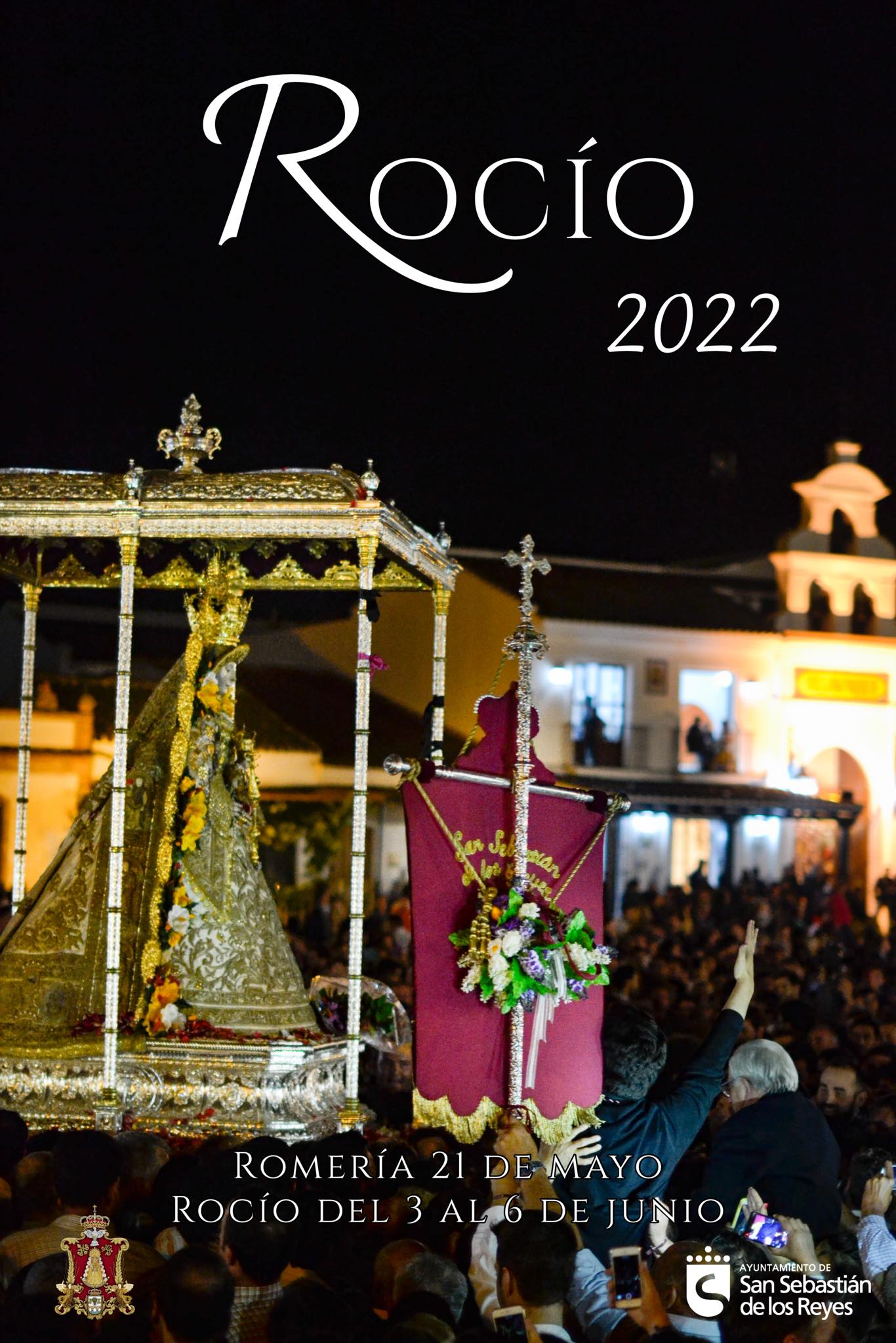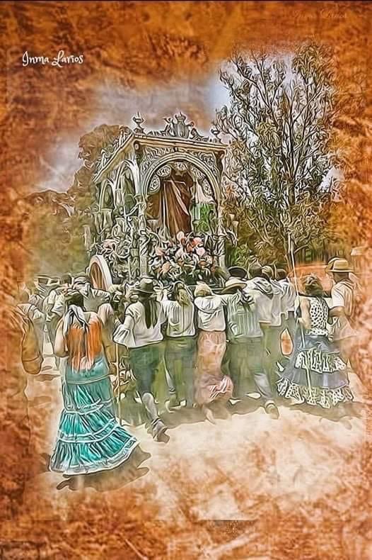 Flanquea a la Patrona de Almonte la mágica luz que desprenden las bengalas del Santo Rosario que antecede su salida triunfal, a hombros de los almonteños. Justo a sus plantas, la palabra “Romería”, esa que tanto anhelamos, contiene en cada letra escenas de la misma: el simpecado de la Matriz a caballo, el discurrir de las carretas, los peregrinos, los sones de los tamborileros, el monumento del Real del Rocío y el Santuario.