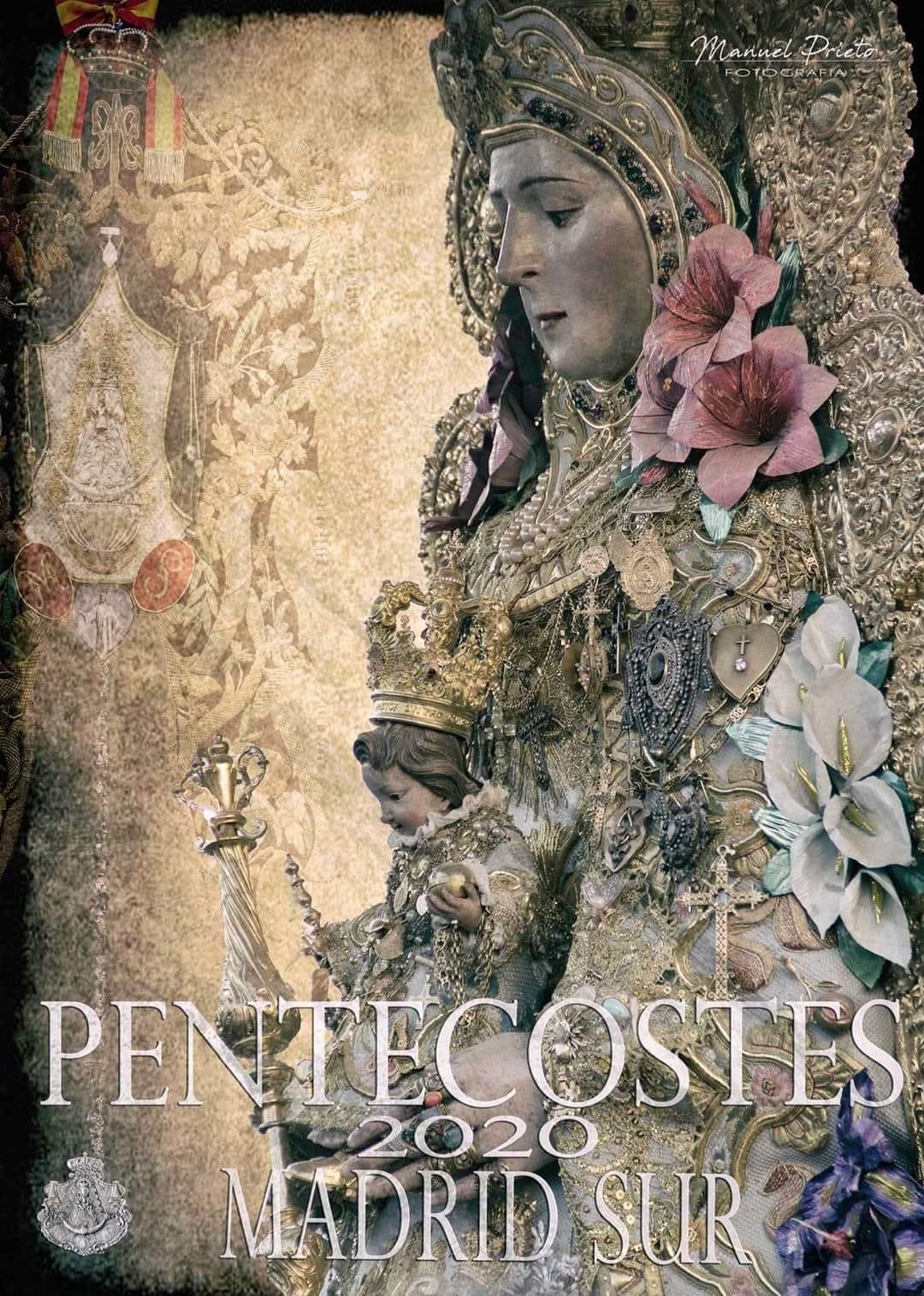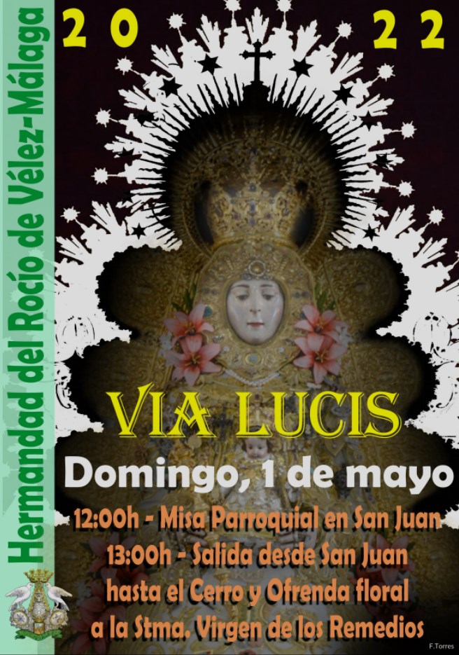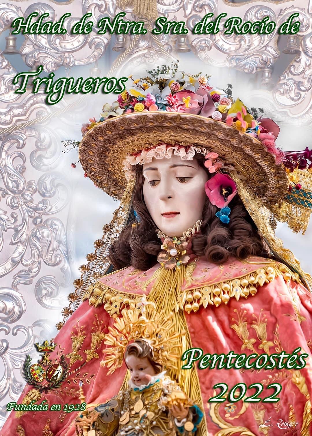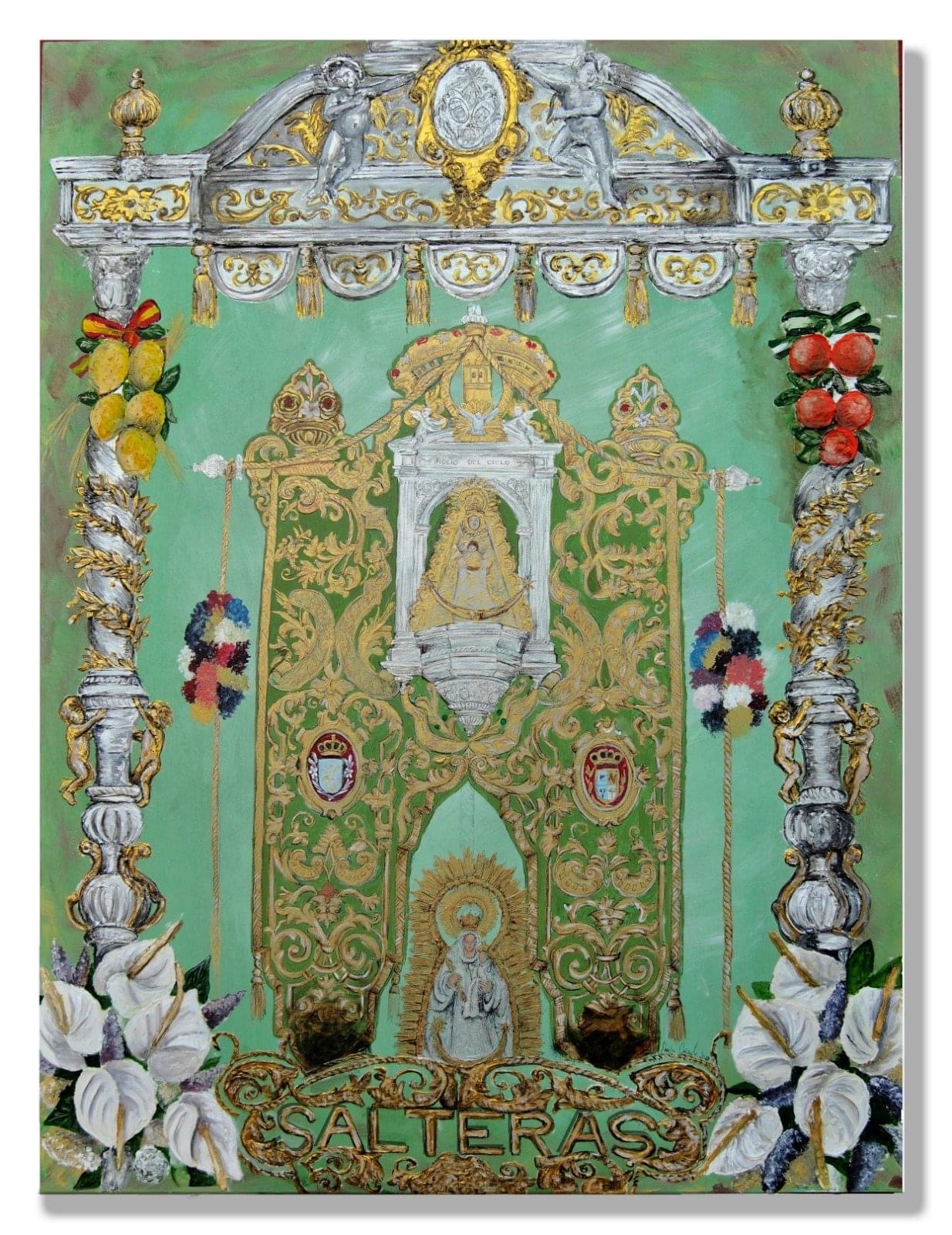 Flanquea a la Patrona de Almonte la mágica luz que desprenden las bengalas del Santo Rosario que antecede su salida triunfal, a hombros de los almonteños. Justo a sus plantas, la palabra “Romería”, esa que tanto anhelamos, contiene en cada letra escenas de la misma: el simpecado de la Matriz a caballo, el discurrir de las carretas, los peregrinos, los sones de los tamborileros, el monumento del Real del Rocío y el Santuario.