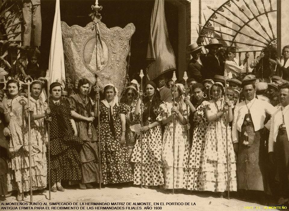 Preciosa fotografía realizada en la Romería de 1930. Junto al simpecado de la Hermandad Matriz de Almonte, en el pórtico de la vieja ermita, reciben a las Hermandades Filiales los almonteños. Ostentan las varas de la Hermandad, y curiosamente portan en sus cuellos la famosa medalla de pandereta, labrada en la década de 1920 con motivo de la Coronación Canónica de 1919.