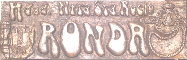 Uno de ellos es una talla en madera de 1,20 X 0,60 realizada por Paco Bautista .Se trata de una especie de cartel anunciador de la Hermandad para situarlo en la aldea en la que sea Casa de Hermandad. Ademas de las letras figuran dos tallas una de ellas del Tajo de