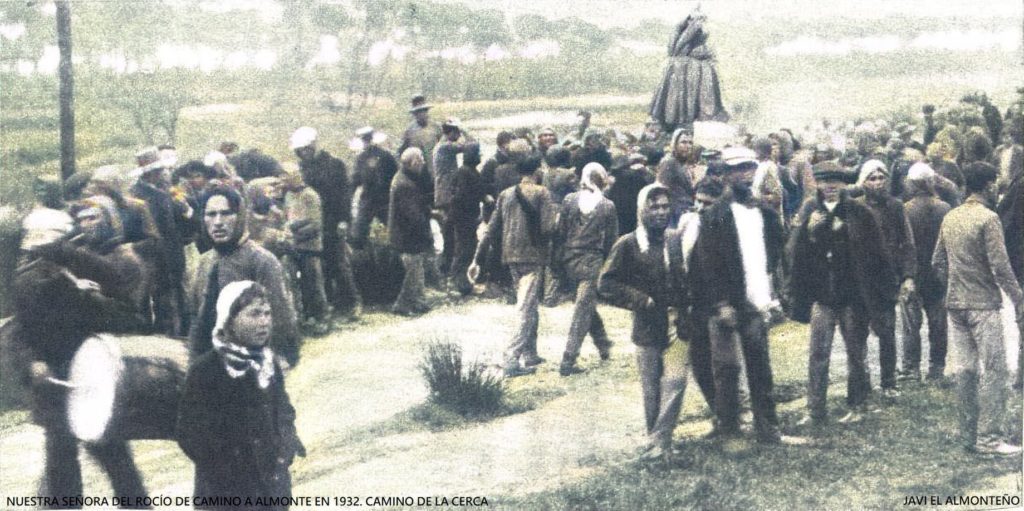 Tras el desagravio ocurrido en la casa del ayuntamiento almonteño por la retirada de los azulejos de la Patrona y el Corazón de Jesús el 28 de febrero, la Imagen de la Virgen prendió un duro camino hacia la localidad desde su santuario en un día donde el mal tiempo hizo estrago. La procesión discurrió por el llamado camino de Los Llanos, procesión que debió de comenzar a las doces en punto de la noche, pero las fuertes lluvias retrasaron la traslación a eso de las ocho de la mañana. Cuando llegaron ya amanecido el día al puente de Olivarejos, construido precisamente un año antes, el crecimiento del arroyo era de tal importancia que anegaba este a su base, optando por una vía poca conocida en lo que relaciona al Rocío. Cruzaron la zona del eucaliptar que se encuentra alrededor de Olivarejos, encaminándose hasta el conocido camino de La Cerca, ya que había una zona en la pasada del arroyo que no cubría tanto como en Olivarejos. La lluvia cesó y el nivel del arroyo bajó. Pudieron pasar. Esto no se recoge en ningún documento, ya que la situación política del momento era muy difícil. Sabemos esta historia por varias personas que lo vivieron, hoy fallecidas. Uno de ellos, comentaba que su padre no lo dejó ir al traslado por ser menor de edad. Acompañó a su progenitor a las labranzas del campo, finca precisamente que se localizaba en el camino de La Cerca. Dice, que entretenido en sus labores, escuchó un tumulto aproximarse, cuando alzo la vista al frente, se encontró a la Virgen a hombros de los rudos hombres que la portaban, se le llenaron los ojos de lágrimas. Este, sin duda alguna, dejó a su padre y se unió a la procesión. El interpretó que ya que no pudo ir a por la Virgen, la Virgen vino a él.