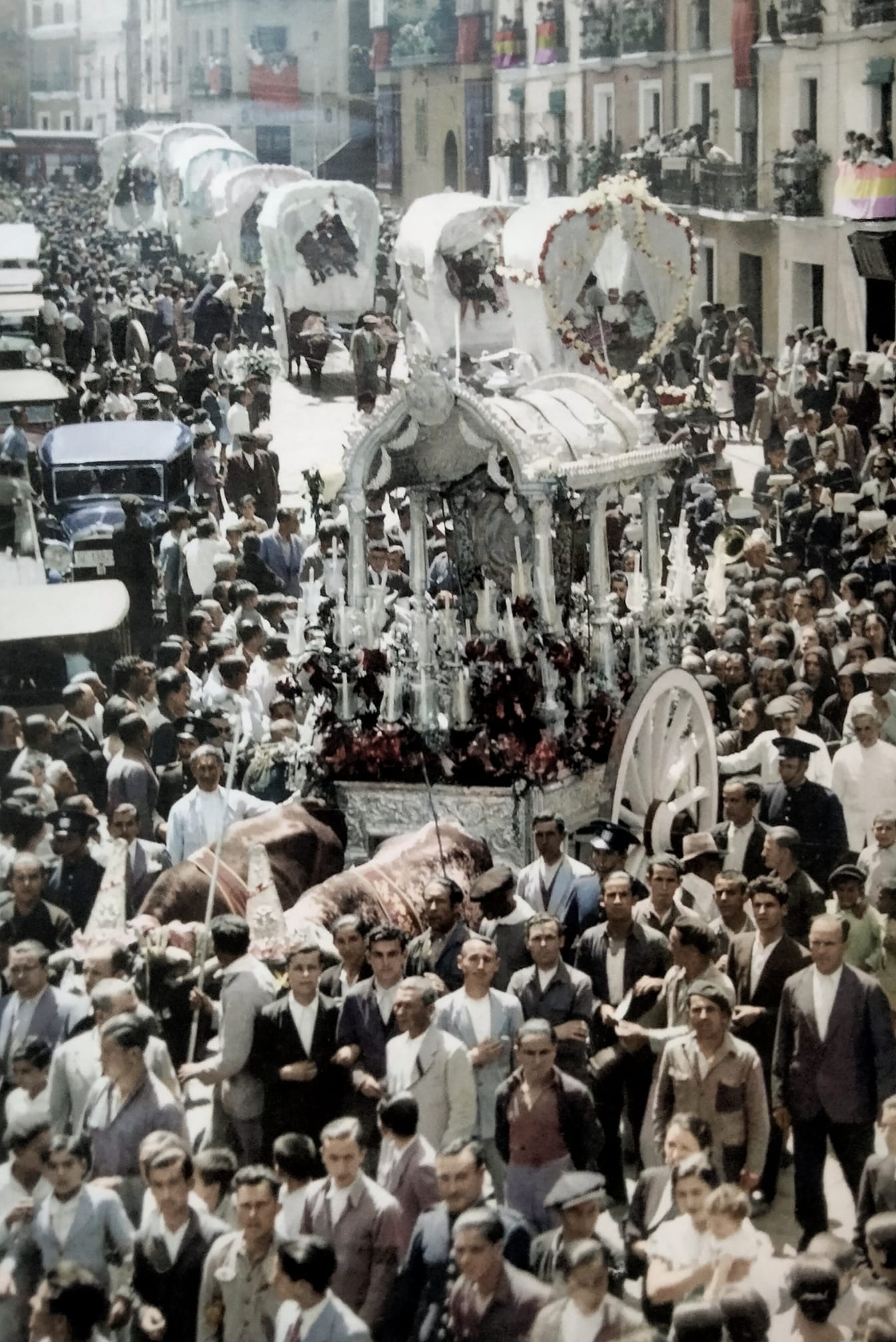 Jueves 6 de junio de 1935, último año que peregrinará en Pentecostés el Antiguo Simpecado del siglo XIX, restaurado y enriquecido en 1919 por Rodríguez Ojeda. Tiempos de la II República, con banderas tricolor en los balcones y guardias de asalto con uniforme azul. Del caserio de la imagen solo queda en pie el número 3 de la calle San Jorge que es donde está tomada la fotografía.