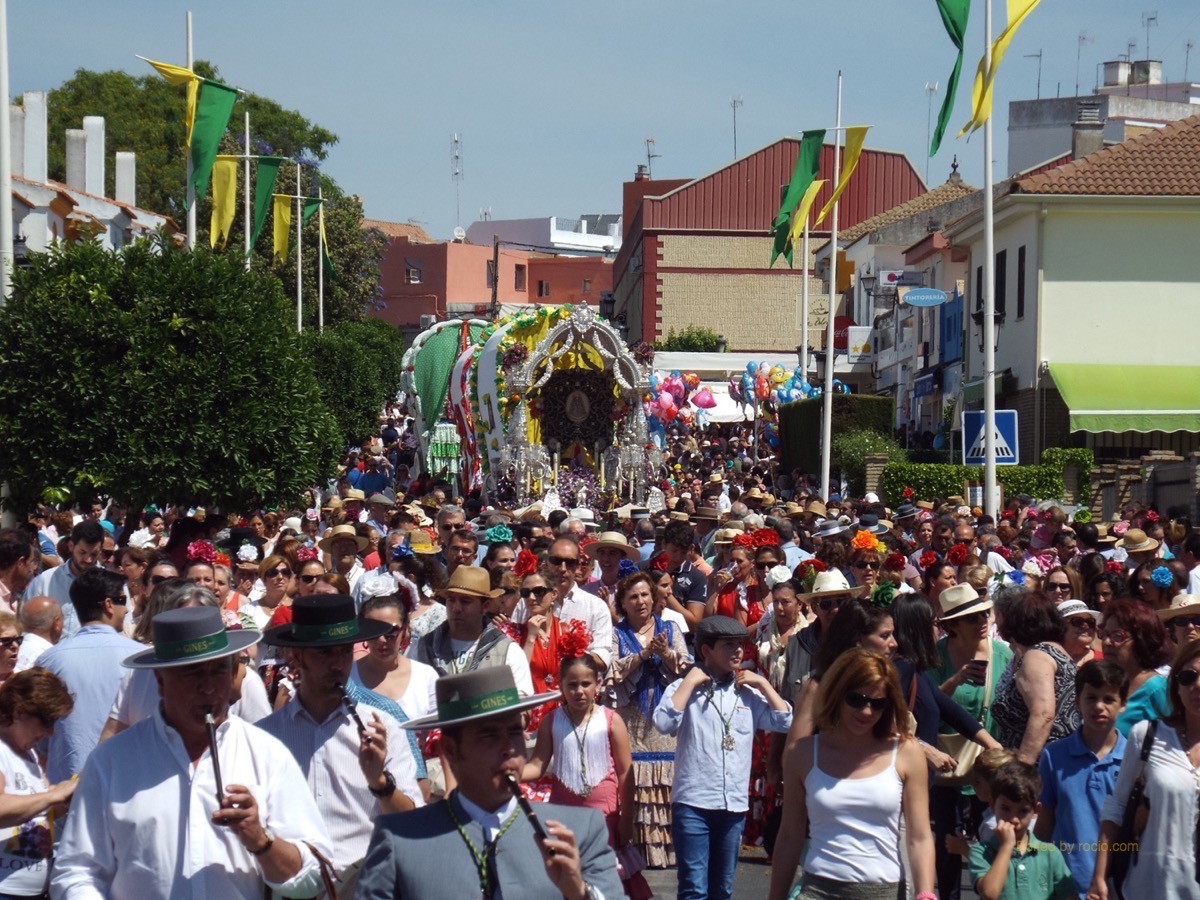 Ante una gran cantidad de personas que llenaban las calles más céntricas de la localidad, la comitiva continuó después su recorrido, que este año incluía como gran novedad la calle Carlota Vega, en respuesta a una petición de los vecinos de la zona. Allí, el coro del colegio Ángel Campano interpretó varias sevillanas ante la carreta del Simpecado, que continuó después en dirección a La Mogaba, para llegar más tarde hasta el Hospital de San Juan de Dios de Bormujos, donde se pidió por la salud de los enfermos y volvieron a vivirse momentos de gran emoción.