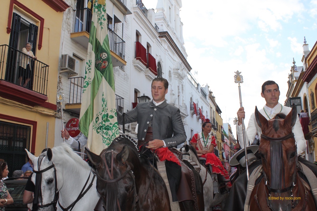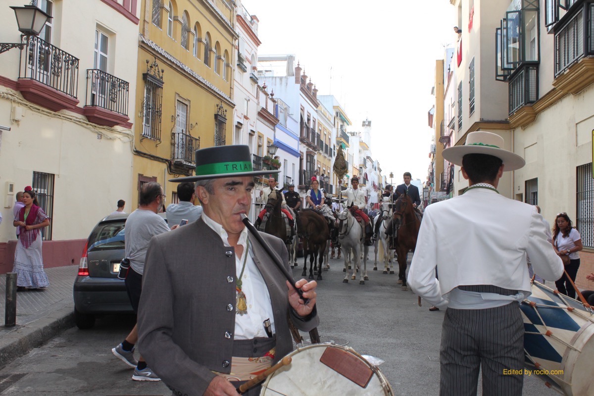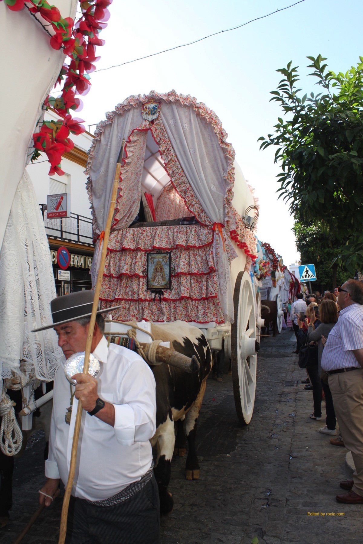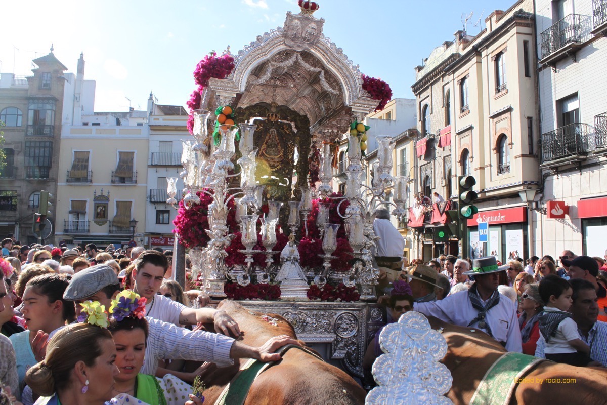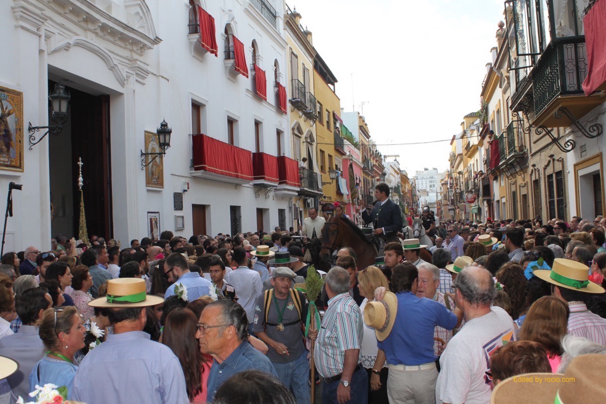 Salida de la Hermandad de Triana 2015. La Hermandad de Triana después de celebrar su Misa de Romeros en su Capilla de la calle Evangelista a las 7,30 de la mañana ha iniciado su camino hacia la aldea almonteña.