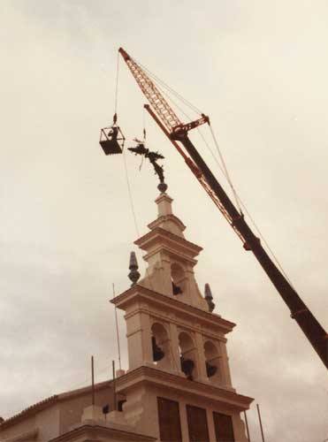 Santuario del Rocío, año 1981. El fuerte viento dobló la recién colocada cruz elaborada por el almonteño Genaro Faraco. El autor de esta obra, advirtió de antemano a los técnicos de la obra de que el hierro que sostenía la cruz, debía de profundizar debidamente en la estructura de hormigón para evitar que el viento doblase la gran cruz. Javier Coronel