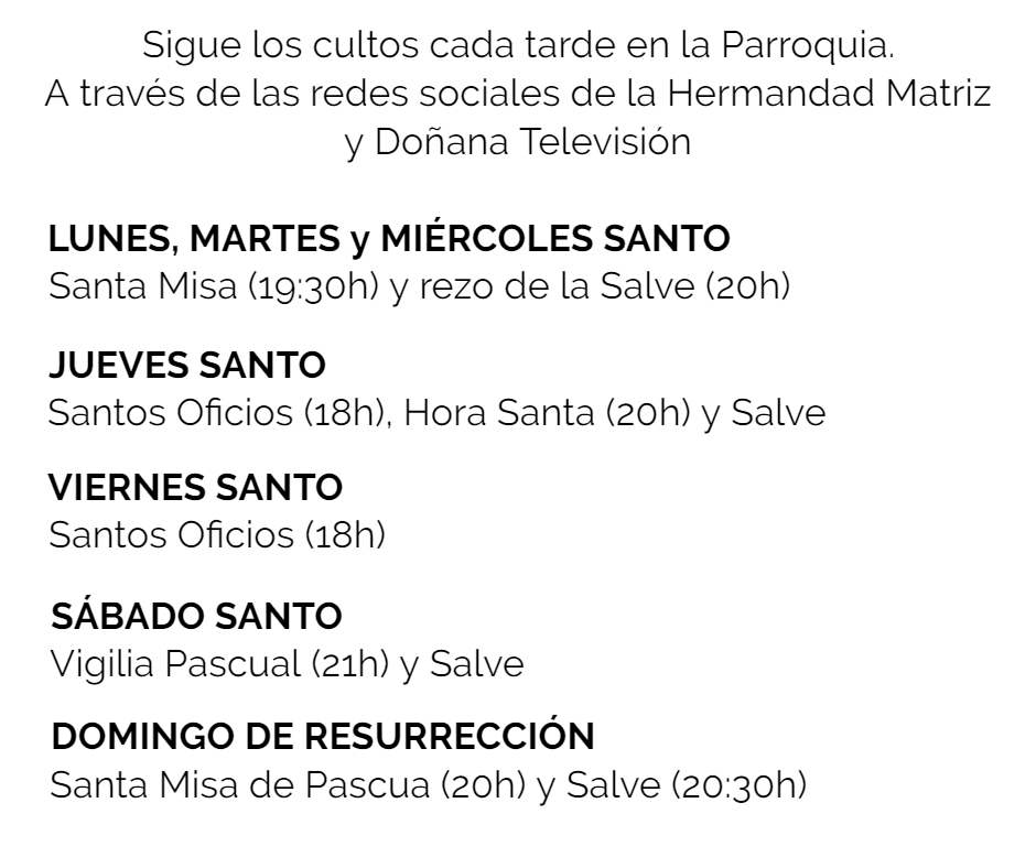 En Semana Santa, sigue también en directo, desde nuestro canal de YouTube, Facebook y Doñana Televisión, los cultos de cada tarde desde la Parroquia de Ntra. Sra. de la Asunción de Almonte.