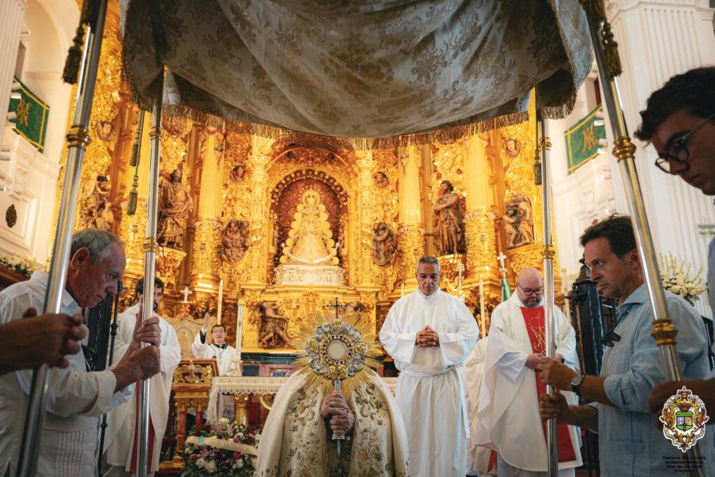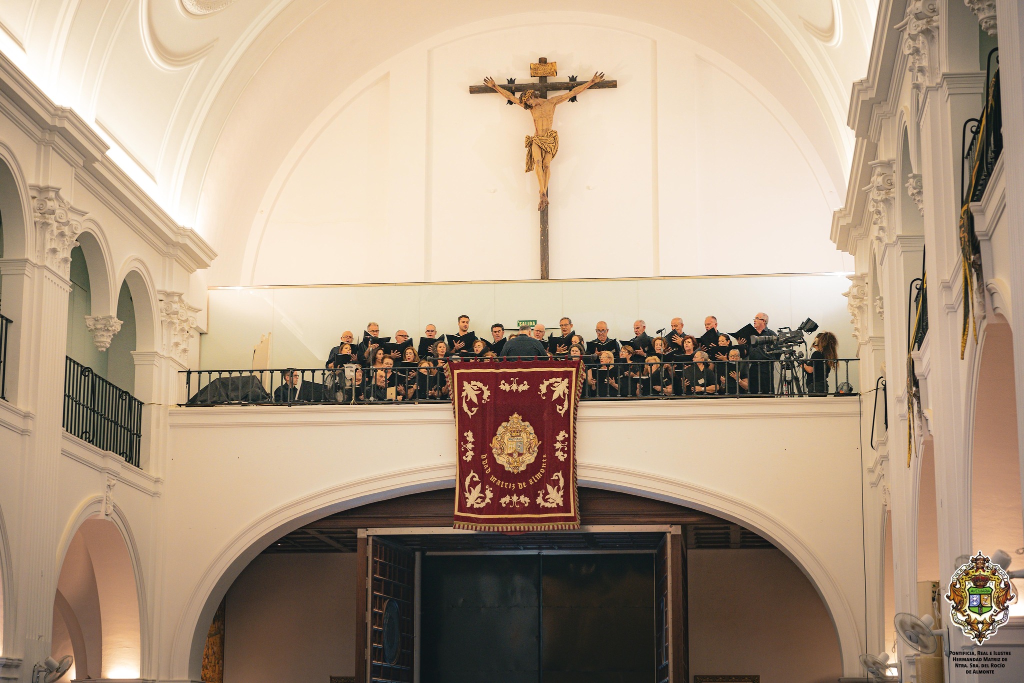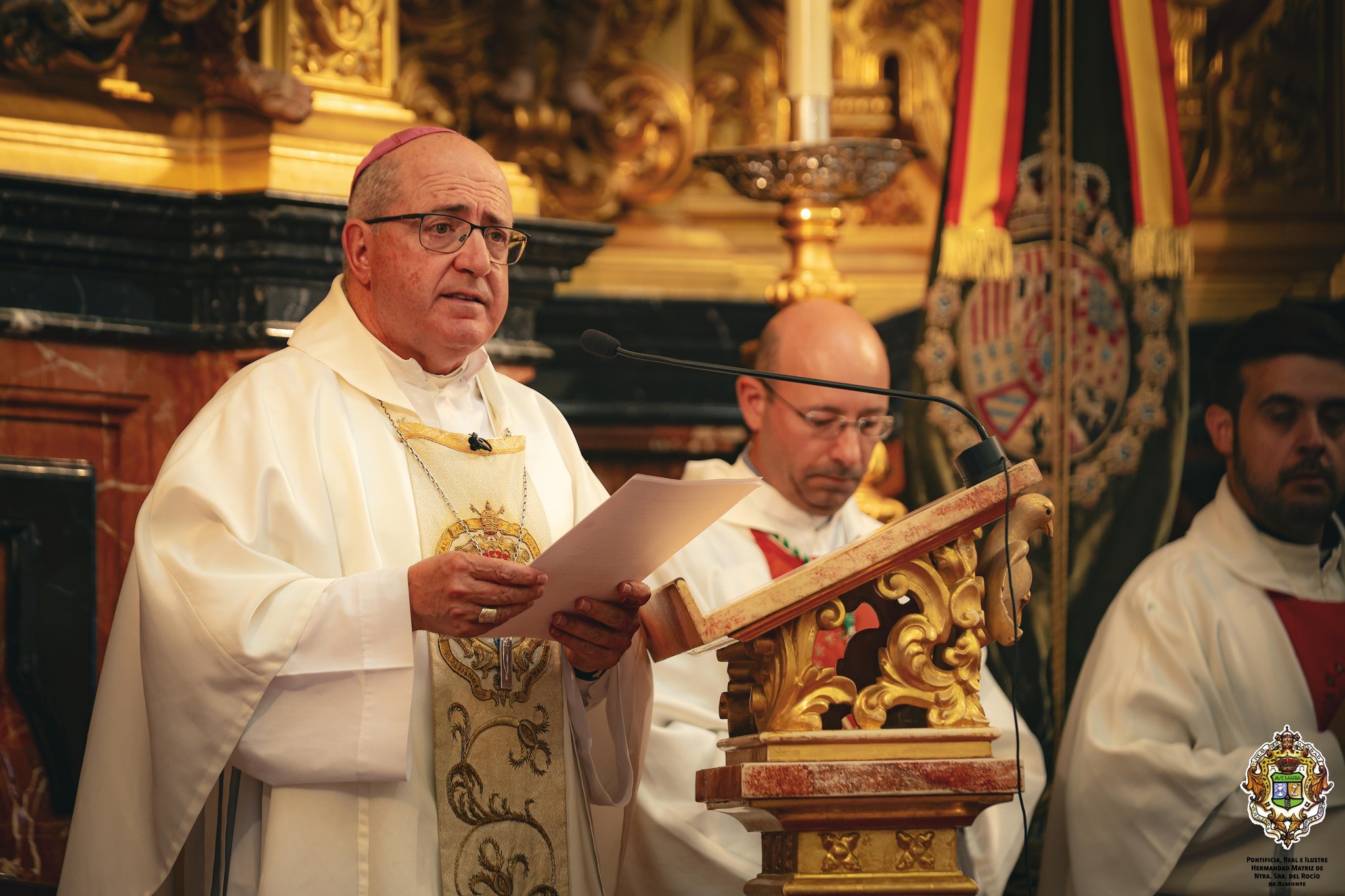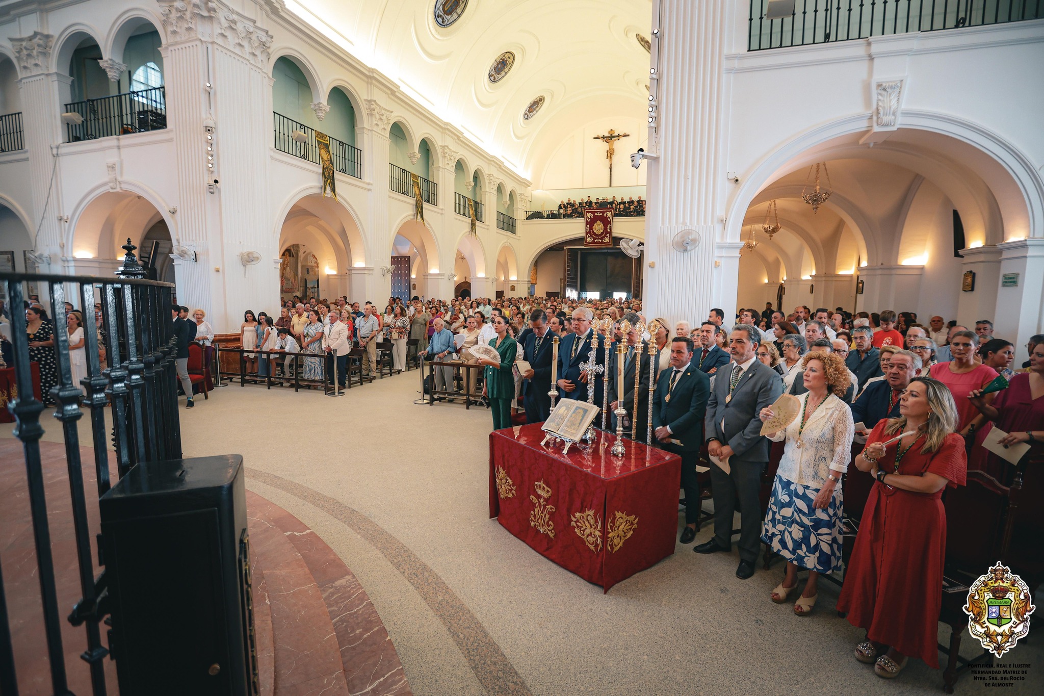 En la Villa de Almonte, a dieciséis días de Agosto de mil ochocientos trece, estando los señores que componen los Cabildos secular y eclesiástico y venerable Hermandad de la Reina de los Ángeles, María Santísima del Rocío que abajo firmarán y señalarán como acostumbran, en la sacristía de la única iglesia parroquial de esta nuestra Villa, por ante mi el escribano-secretario del Ayuntamiento Constitucional y Hermano Mayor de la referida Hermandad, para tratar y conferenciar las cosas pertenecientes al justo y debido reconocimiento en que debemos vivir; y demostración en alguna parte de la acción de gracias que debemos tributar a tan Soberana imagen, acordaron lo siguiente: