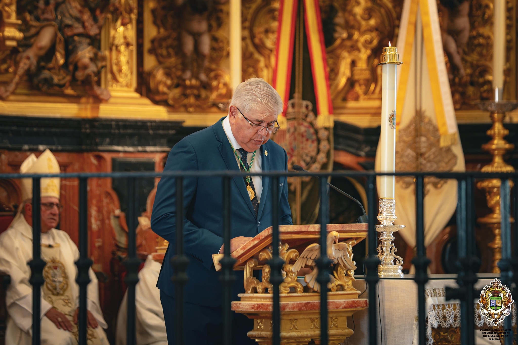 En este acto se hizo presente por el Sr. Presidente, que son tantos los innumerables prodigios y aún conocidos milagros, que ha obrado la Reina de los Ángeles María Santísima del Rocío en todas las épocas desde su memorable y sagrada aparición, con esta Villa y todos sus naturales y ciudadanos que han tenido el honor de visitar su ermita, que los ha obligado, aún en los climas mas remotos de Ultramar; a fundar capellanías y establecer monumentos de gratitud, y sin atender a los singulares beneficios, que en la antigüedad ha merecido esta afortunada población de tan soberana imagen contrayéndose los que abajo firman solamente al prodigio que los ha estimulado a la reunión de voluntades de que se hará expresión no pueden menos, para que en todo tiempo conste y que los venideros puedan aumentar su devoción hacia tan soberana Madre, que después de Dios nos hace existir, que manifestar; que por la desgracia de los hados se hallaba el reino sumergido en el mayor abatimiento por la intriga de los favoritos, que habían conseguido dejar a la nación española en la mayor miseria, extrayendo de este hermoso reino lo más florido de sus tropas a países extranjeros, a servir al más inaudito y feroz tirano que se ha conocido, Napoleón, Emperador de los franceses, entregándose bajo los pretextos capelosos las fortalezas que dividen este reino del de Francia y aún la misma capital, Madrid; hasta que el día diez y nueve de Marzo de mil ochocientos ocho, improvisamente, y sin que pudiera preverlo la astucia del Favorito, se levantó una gloriosa revolución en el Real sitio de Aranjuez por la cual abdicó la corona nuestro católico monarca el Señor Don Carlos IV en el señor Príncipe de Asturias, proclamándolo, recibiéndolo y jurándolo toda la nación inmediatamente por su legítimo rey que lo es Señor Don Fernando VII (que Dios guarde muchos años); con cuya novedad ocurriendo el Tirano a nuevos ardides de su felonía la intentó engañar; como lo hizo, a nuestro joven monarca, llamándolo para conferenciar en la ciudad de Bayona, como población rayana del reino de Francia, bajo de las palabras de honor y seguridades, que no dejaron la más leve duda, al más virtuoso de los monarcas, arrebatándose así mismo todos los señores reyes e infantes de la Casa Real con tal escándalo que, por que el patriota pueblo español, Madrid, trató de impedir la salida del infante D. Antonio y demás personas de la Casa Real, que aún existían en aquella capital, tomando la mano y haciéndose parte el digno satélite del tirano Emperador; Murat, tan sanguiniario como su Amo, sacrificó a las primeras víctimas de nuestra sagrada revolución el 2 de Mayo del mismo año de 1.808, tratando a dicha capital, como el pueblo mas enemigo y rebelde, degollando y destruyendo la población en los términos más inauditos, teniendo la avilantez, por estar guarnecido con un formidable ejército de ocientos mil homhres, con el cual se creía señor de la valiente y nunca bien ponderada Nación Española, de expedir un bárbaro decreto imponiendo pena de la vida a el español que matase a un francés, y la de incendiar; saquear y degollar la población y sus habitantes, donde se encontrare derramada la sangre francesa; cuyo execrable atentado irritó el generoso corazón español en tales términos, que no acobardándolo lo numeroso y aguerrido de las tropas enemigas, que contaban con ochocientas mil bayonetas y más de cien mil caballos, levantó el sagrado grito de la libertad de su Religión, adorado Monarca y amada Patria, declarando abiertamente la guerra al expresado tirano, quien creyendo acabar con la nación, arrojó un formidable torrente de tropas a las Andalucías, y el pueblo, que defendía su justa causa, los destruyó y derrotó en la única bien ponderada batalla de Bailén, el diez y seis de junio del mismo año; con cuyo hecho, irritado más más el tirano. se arrojó personalmente el dos de Diciembre del citado año, aunque disfrazado, a la expresada capital, Madrid, con un torrente de tropas, que inundaron las provincias por donde transitaron, y se extendieron a la mayor parte de la Península española. En cuyo miserable estado y careciendo de fuerzas humanas, en general y particular; el mariano y católico pueblo español acudió a las divinas, impetrando en tanta necesidad y, aflicción el auxilio del Todopoderoso, y especialmente el pueblo de Almonte, no arreviéndose por sí mismo, por carecer de méritos a rogar al Señor de los Ejércitos por la prosperidad de la nación, se arrojó a los pies de las Reina de los Ángeles María Santísima, Nuestra Madre y Señora del Rocío; pasó en devoto procesión y penitencia ante su ermita de donde en hombros de la fe, con admiración de la Península, la trasladó a esta única Iglesia Parroquial el día 11 de Enero de mil ochocientos nueve, desde el cual principiaron las rotativas públicas y secretas, cantando todas, las noches infaliblemente la Salve con asistencia de todo el clero, concurso del más devoto de los pueblos mariainos, por cuyas súplicas, y lo que es más, por el conocido y deducido empeño dc la Reina de los Ángeles, María Santísima, en favorecer a sus devotos, se ha conseguido la existencia de este pueblo, pues el veinte y ocho de Febrero del año del mil ochocientos diez, habiendo ocupado los enemigos las Andalucías y este nuestro hermoso pais, recibiendo la Autoridad de esta Villa una leve proclama del general español Santisteban, que estaba con muy poca gente en la. Villa de Niebla, pidiendo auxilio convocó y alarmó esta población haciéndola levantar en masa contra los franceses, en cuyo acto se recibió a las dos de la madrugada un oficio del Comandante francés, el Príncipe de Aretnberg, mandando se le remitiese inmediatamente un crecidísimo suministro para sus tropas, que, llenas del mayor orgullo, se hallaban en la Villa de La Palma; y en lugar de obedecer su mandato este pueblo generoso, pren