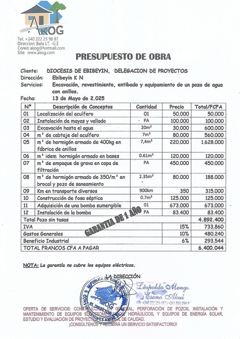 La diócesis de Ebibeyin que ya ha construido muchos pozos será la garante del correcto uso de los mismos. En nuestro caso el control de la ejecución del proyecto la llevaría el Padre GABRIEL ELA ABESO MOKUY.