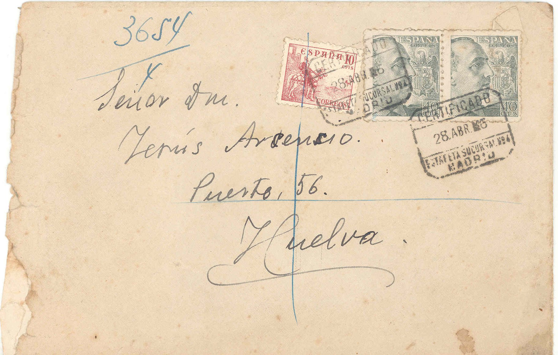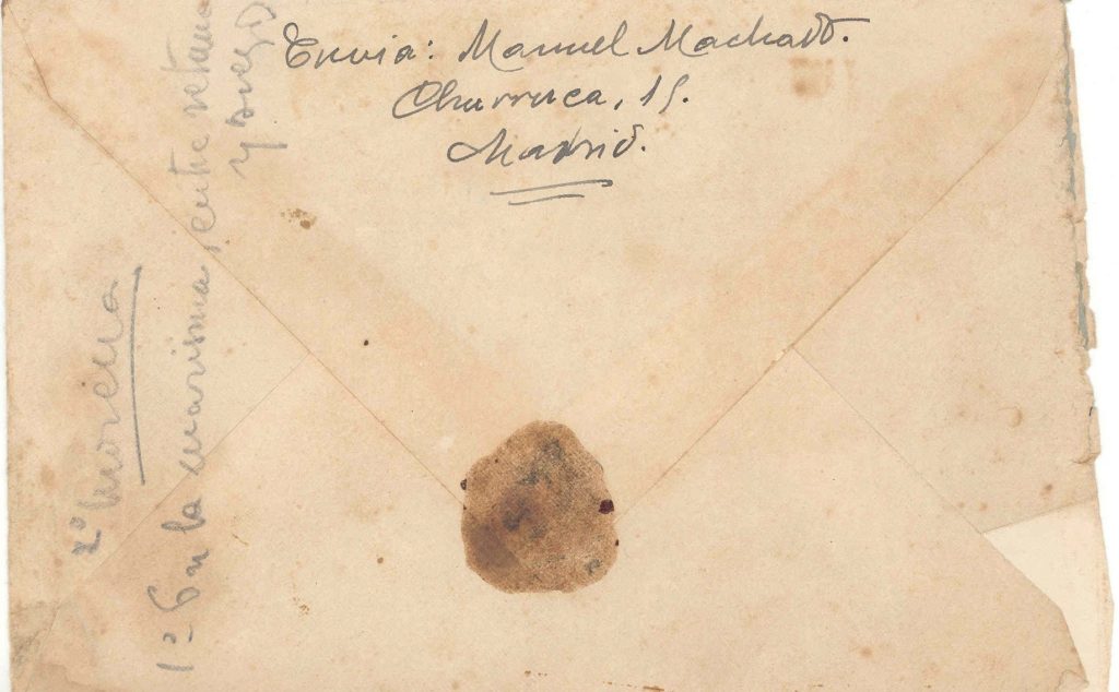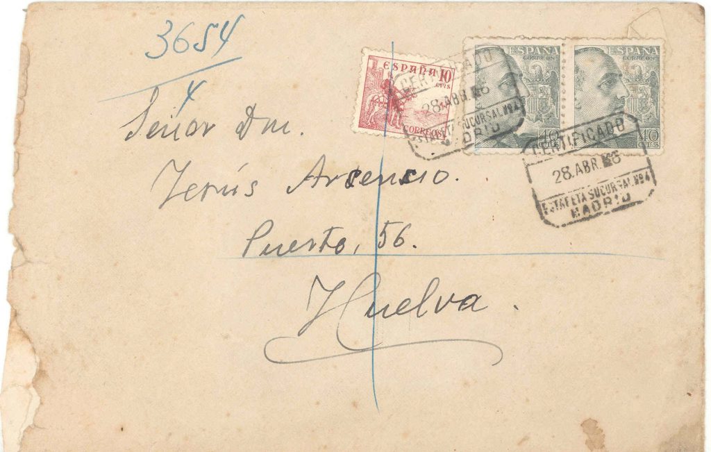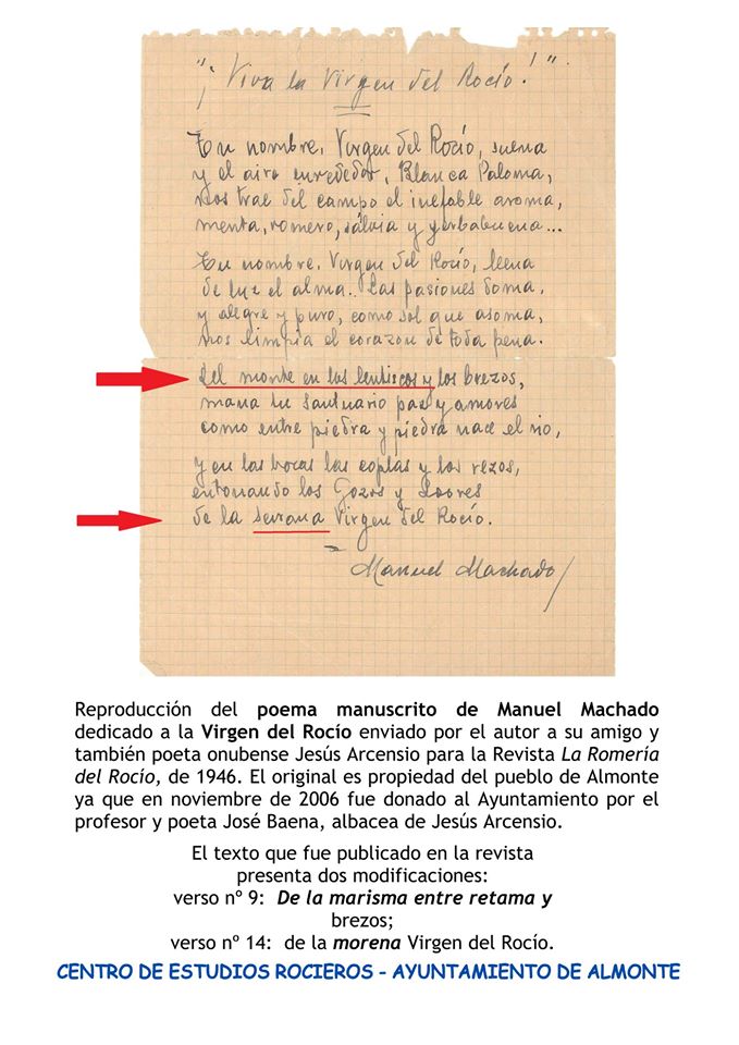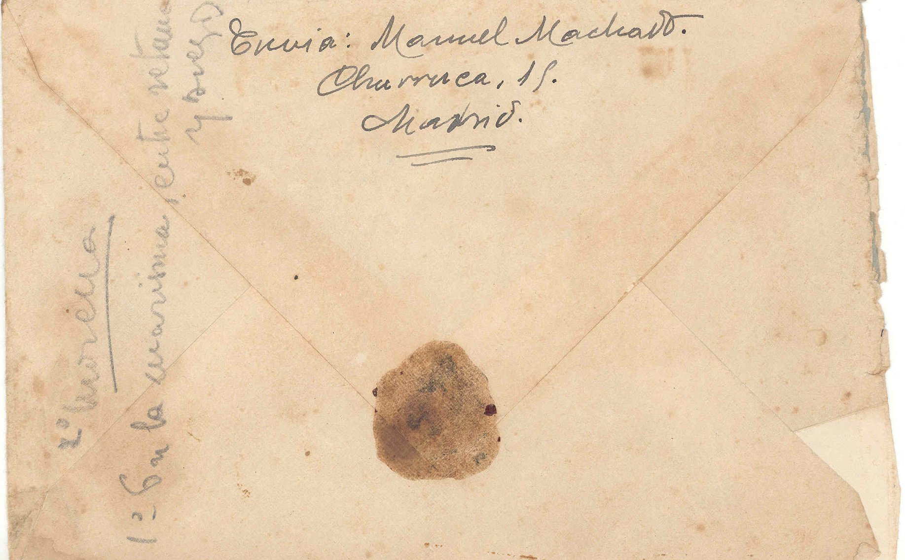 Reproducción del sobre original (anverso y reverso) con el que el poeta Manuel Machado dirige a su amigo Jesús Arcensio un poema dedicado a la Virgen del Rocío a petición de este para la edición de la Revista “La Romería del Rocío” de 1946. La carta lleva la fecha de 26 de abril de 1946; el matasellos, de 28 del mismo mes y año. REPRODUCCIÓN DEL POEMA MANUSCRITO.