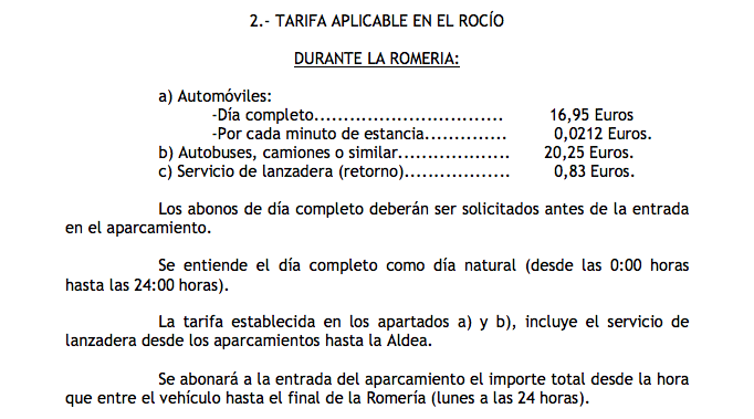 Esto es una poca berguenza y un robo a mana armada q hay q dejar el coche al solijero y en terregal y pagar esa dineral diario . suerte tienen q los rociero tenemos mucha fe y no tenemos mas remedio q tragar .pero dios quiera q eso cambie q lo dudo per la fe muebe montaña