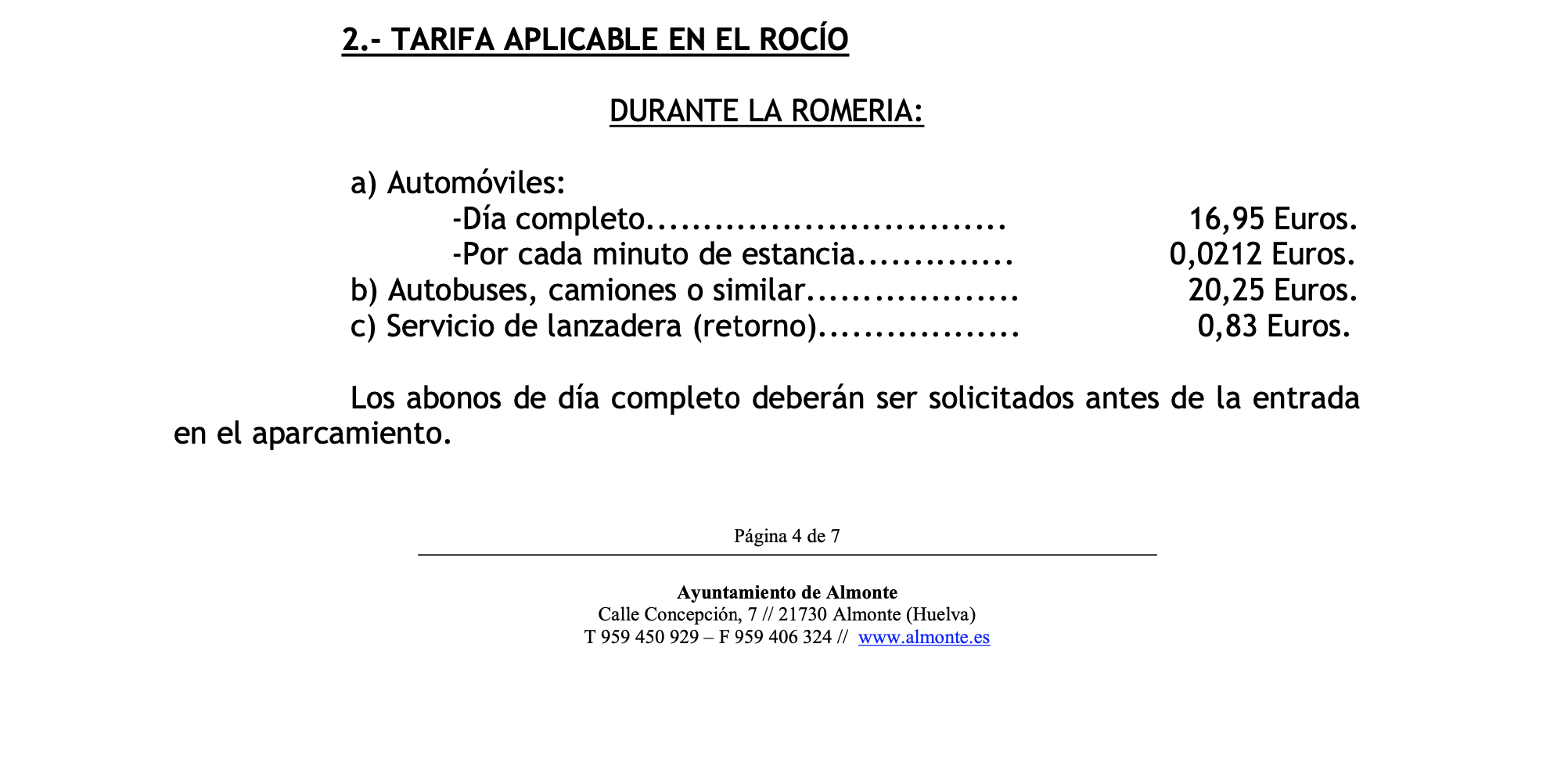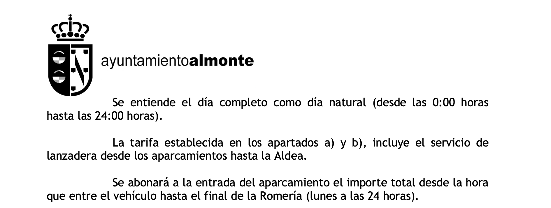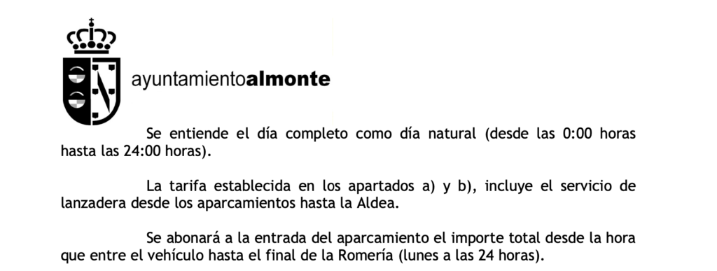 Se abonará a la entrada del aparcamiento el importe desde la hora que entre el vehículo hasta el final de la Romería (lunes a las 24 horas).